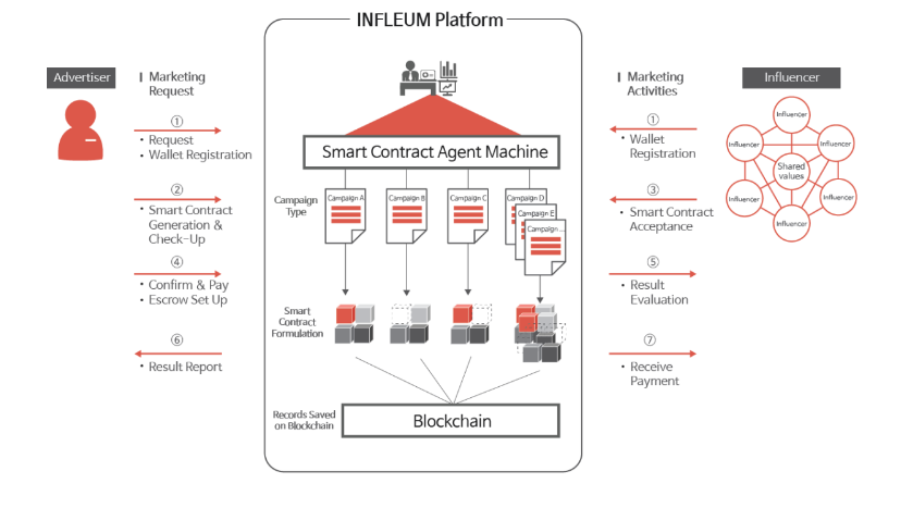 Advertising and Marketing is main functions of INFLEUM platform. The above image depicts clearly how users can interact with infleum platform for becoming a infleuncer or advertiser. Advertisers use smart contract to create various campaigns which are required for brand building and establishing relationship with user. There is special training needed to create campaigns.