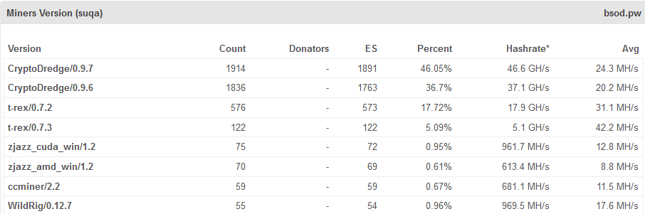 From the above mining pool list bsod.pw is where more number of miners are at. If we look at the miner version then majority of users seem to be using CryptoDredge, T-Rex and zjazz miner. So it is better to choose any of these.