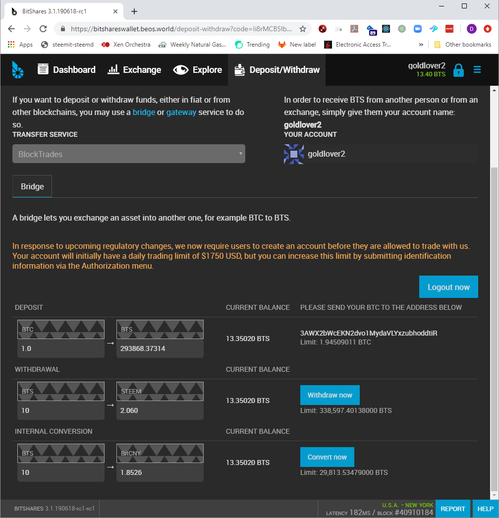 The only change on this page is the addition of a "Logout now" button to end your login to BlockTrades.