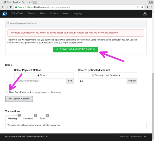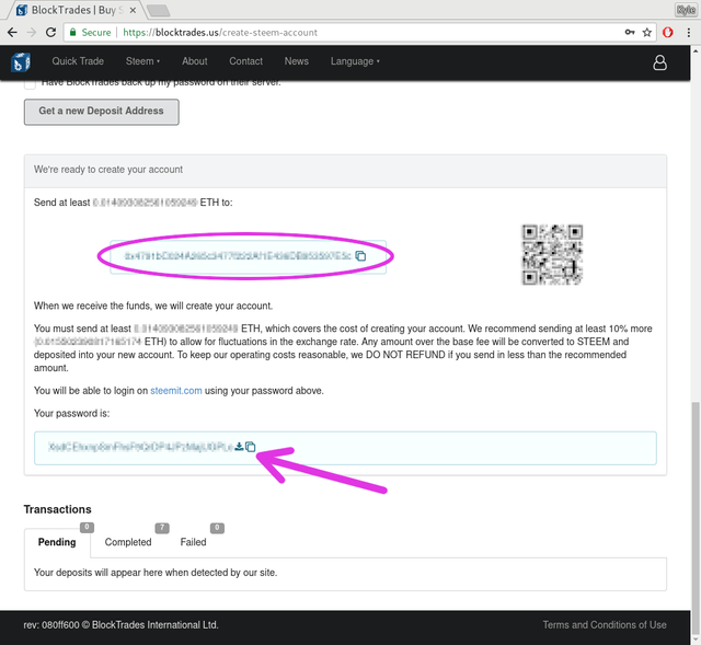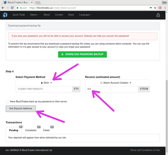 Nuestro sistema generará una dirección de depósito o un memo para adjuntar a su transferencia, dependiendo del tipo de criptomoneda que esté utilizando, y le dará una cantidad mínima para enviar a esa dirección para crear su nueva cuenta Steem.