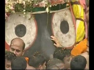 The two brothers, Balabhadra and Jagannatha are decorated with large, elaborate floral decorations called tahia. These are like huge crowns or tiara but are fixed at the back of their heads. These are made of a variety of white, orange and lotus flowers, leaves and pieces of cork fixed to a semi – circular heart shaped bamboo frame. The two brothers decorated with the tahias are carried forward in a slow, swaying movement, giving the illusion of a huge elephant gracefully and gently stepping out. The privilege of providing these tahias is with the Raghavadasa matha- a monastery associated with the temple. Hundreds and thousands of devotees eagerly await a glimpse of the deities. As the deities step out of the main entrance of the temple, the Sinhadwara – Lion’s Gate, the teeming devotees, bhaktas go wild with ecstasy, chanting the name of the Lord in a loud chorus. The chant Haribol – literally means to utter the name of Hari, the Lord.