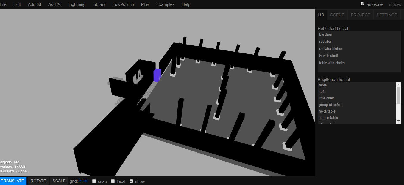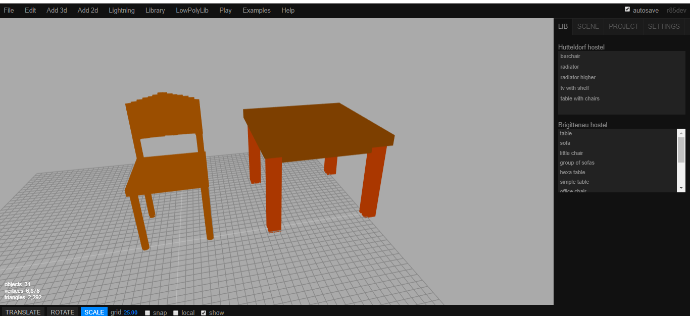 Levi took a lot of photos from the rooms of the hotel. They split up the works and he made the chairs and tables. The chair was difficult because there was a curve. After that he started to learn javaScript to move the camera in play mode in the 3D modelling program. He didn’t succeeded yet.