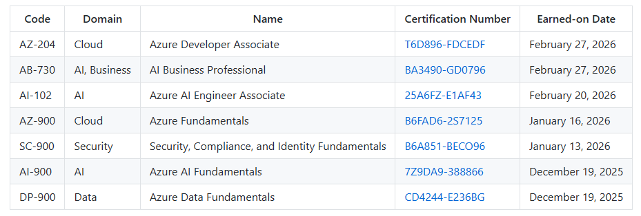 - Development: AZ-204 (Azure Developer Associate)