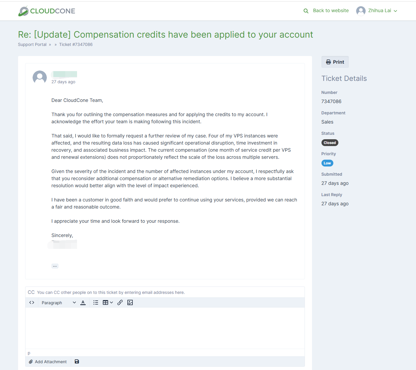 Dear CloudCone Team,Thank you for outlining the compensation measures and for applying the credits to my account. I acknowledge the effort your team is making following this incident.