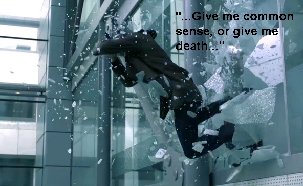 Barry stands up, and jumps out through the glass window on the 7th floor , screaming.....