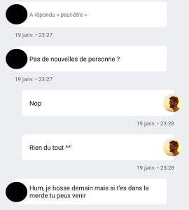 Dans l'après midi du samedi, il m'envoi un message sur l'application pour me donner son numéro et me préciser qu'il ne sera pas dispo avant 22h30 car il travaille. Toute l'après-midi, je le tiens au courant de mon avancé, pour finalement annoncé mon heure d'arrivée.