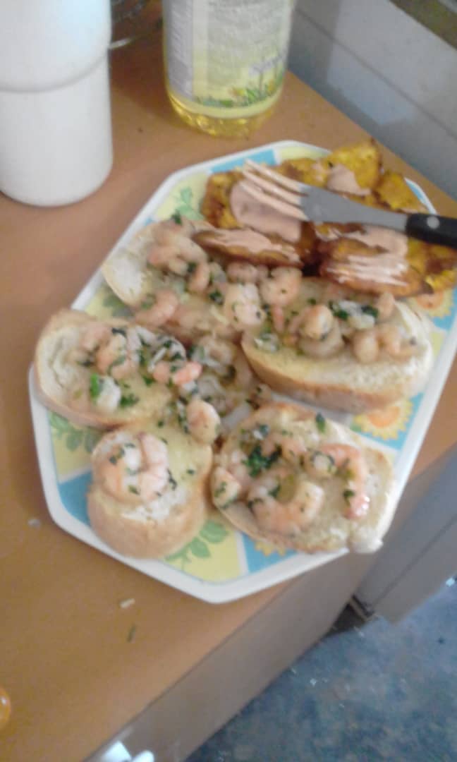 Mi madre decidió cocinar sopa para el almuerzo del dia de hoy, y como a mi no me gusta la sopa me preparo un puñado de camarones al ajillo con unos patacones, ella me contó que comía esto muchísimo cuando estaba mas joven e iba a la playa con sus amistades, que de hecho era considerado una comida cualquiera en la playa y que era la receta más simple de preparar los camarones sin tener que hervirlos, se que la historia no es muy interesant, pero me parece curioso que tomara esa decisión, y al final solo me dijo que ella quería que yo probara los placeres de comer algo de la playa sin tener que estar en ella. Y les puedo asegurar que si me sentí en la playa.