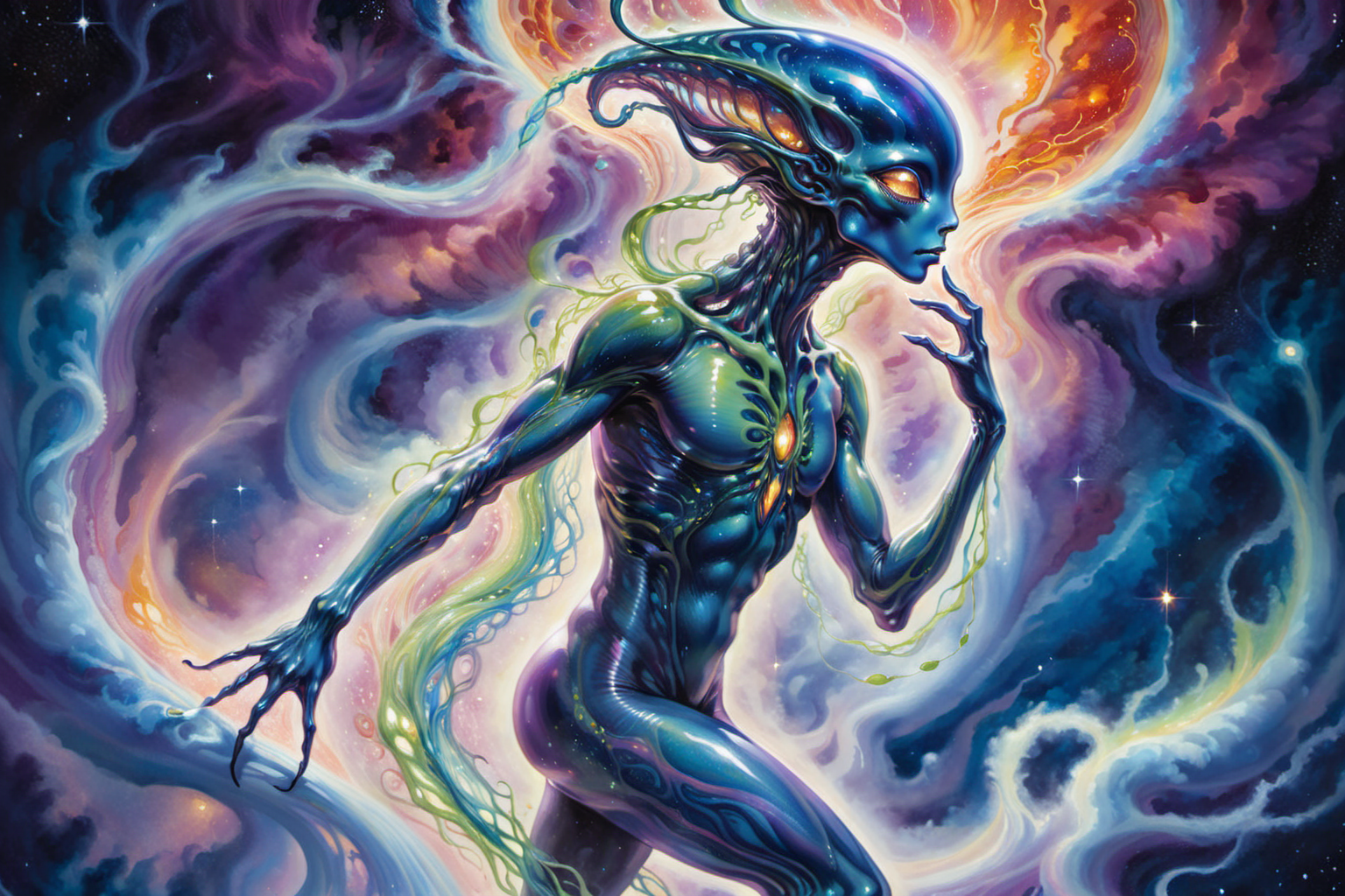 magine an alien being with translucent, iridescent skin, emitting a soft, ethereal glow. Its form is elegant yet otherworldly, with elongated limbs that seem to flow seamlessly into its surroundings. Its eyes are large and multifaceted, reflecting the cosmos within them. Instead of a mouth, it communicates through intricate patterns of light that dance across its skin. The alien stands against a backdrop of swirling nebulae, its presence both serene and mesmerizing.