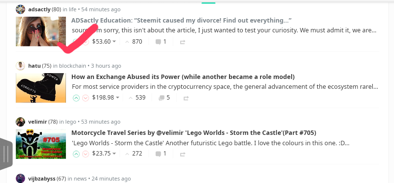 Liking and commenting on other users' posts are also ways to earn some coins on steemit. As a new user go to either Hot, New, or Trending section from your account menu to view, like, and comment on posts. Take for instance you visit the Hot section and love this post caption by @adsactly.