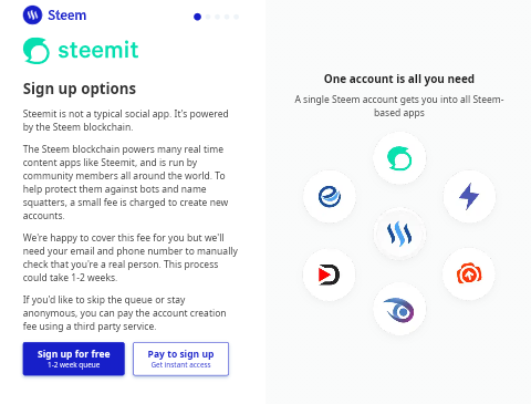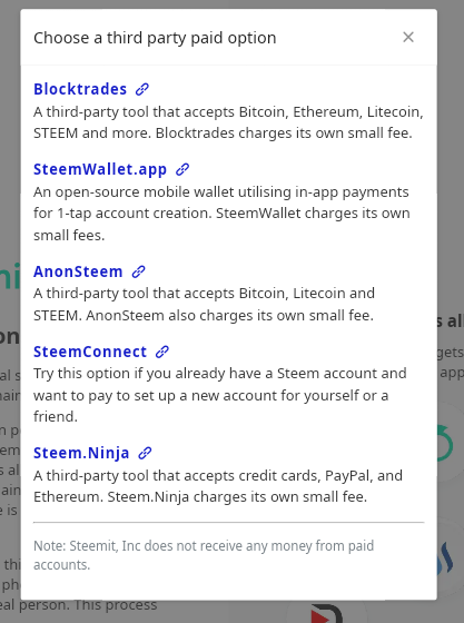 - You are presented with two option to sign up - a free account using steemit sign up services, or a paid instant account using third parties as those listed.