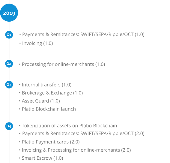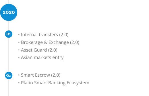 Platio Smart Banking Ecosystem (“Platio Ecosystem”), our goal is to make cryptocurrency a widespread means of payment by increasing its utility. Platio focus is to provide traditional financial services to the digital currencies community in a secure and compliant way. The Platio Ecosystem will be based on a seamlessly operated mobile and web interface, where users will have all the necessary data and tools at their fingertips to instantly transact with crypto, fiat or stock. Platio’s platform will be built on EOS technology, capable of hosting smooth, routine interactions of Platio’s multilayered ecosystem. The Platio Ecosystem will facilitate financial operations in fiat, crypto and common stocks all within one ecosystem. It will also enhance the utility of crypto assets with two unique products: Asset Guard and Smart Escrow.