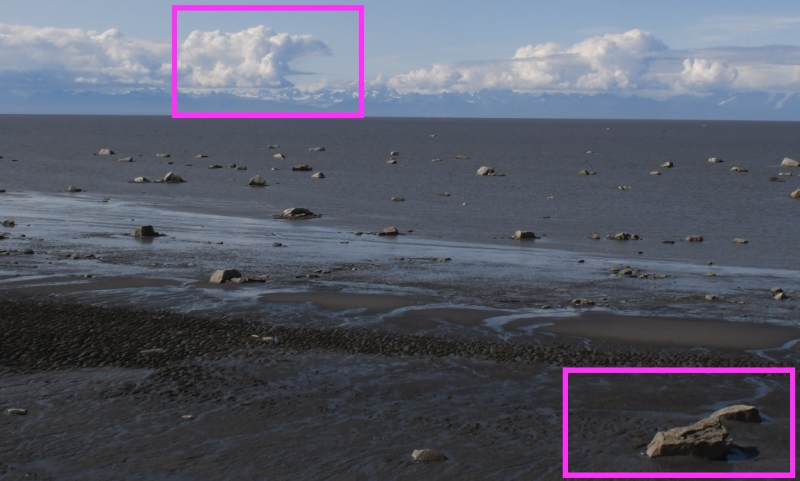 I picked this field of water logged boulders for the challenge this Sunday. I know from the distance these do not look very big. Some of them are not but some of them are quite large. This is the area of smaller boulders, to the north they get much larger. Very large in fact. But this one I liked because of the similarity of the smaller boulder in the foreground, and the cloud over the mountains. See the pink boxes below.