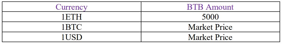 Currently Presale period is live until September 30th. Investors will be able to buy BTB with using ETH, BTC and USD according to the following table: