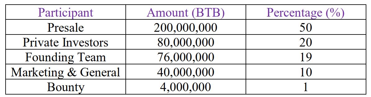 BTB is an ERC20 token. Total amount of 400 million BTB coins will be distributed according to the following tables: