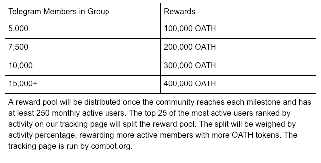 We have allocated 5,000,000 OATH to our Telegram Bounty program out of which 1,000,000 OATH