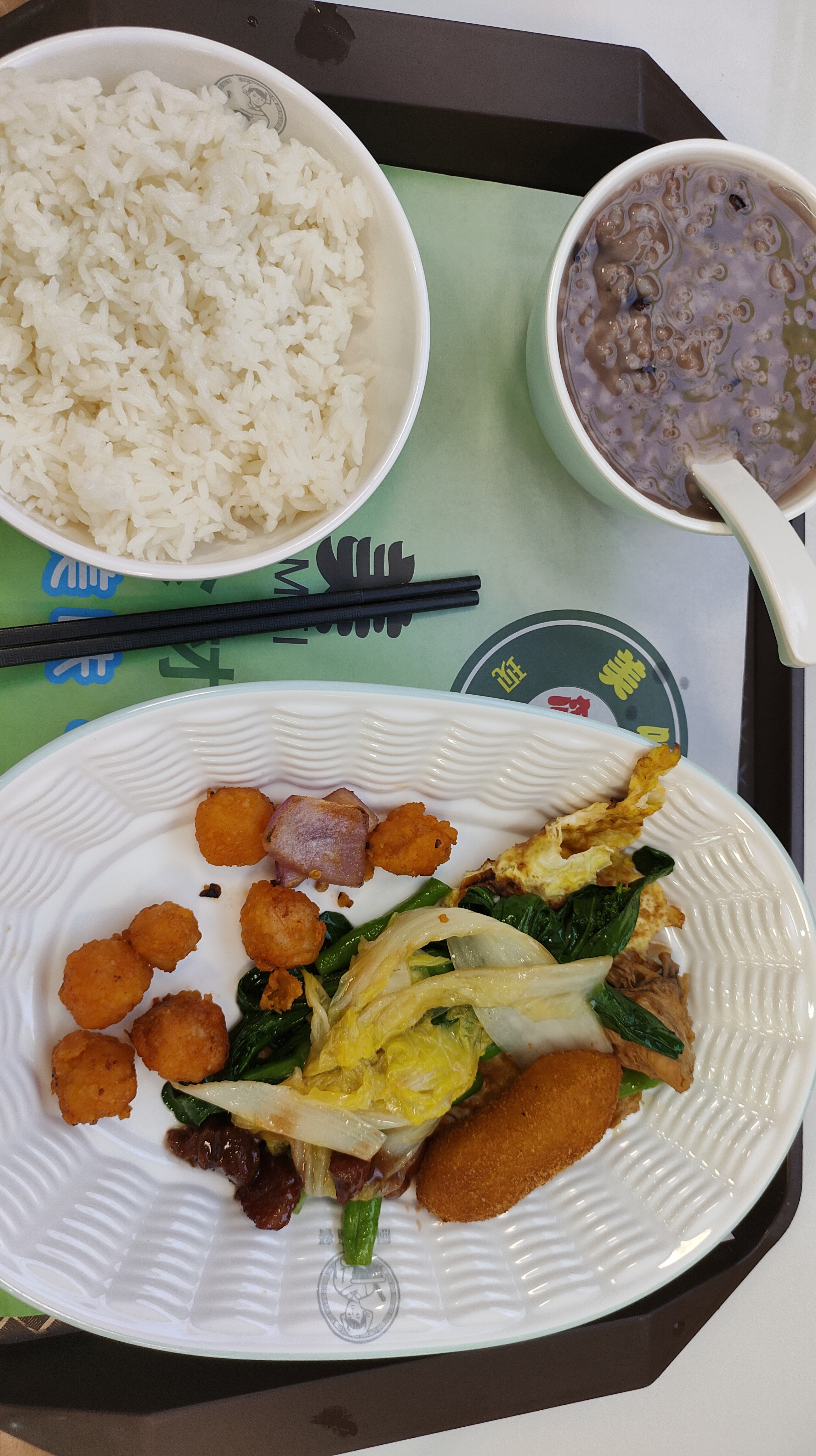 食堂的晚饭,托盘里摆着简单又暖胃的一餐。一碗饱满的白米饭粒粒分明,一旁是稠糯的杂粮粥,带着淡淡的豆香。餐盘里荤素搭配丰富,金黄的炸物香酥诱人,清炒时蔬鲜绿脆嫩,还有煎蛋、洋葱和微焦的肉片,色彩鲜亮。筷子静静放在餐垫上,暖黄的灯光下,这一份家常的烟火气,驱散了一天的疲惫,吃得踏实又满足。