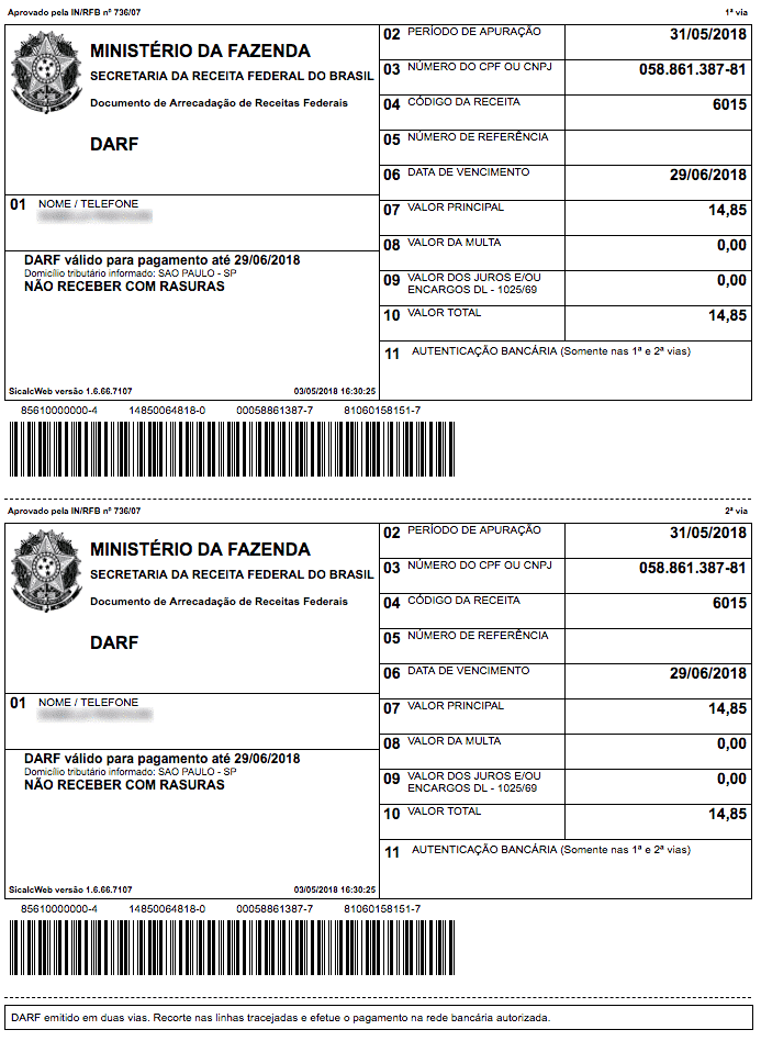 Ao emitir o DARF, a carinha dele é esta aqui. Ele já vem com código de barras para agilizar o pagamento: