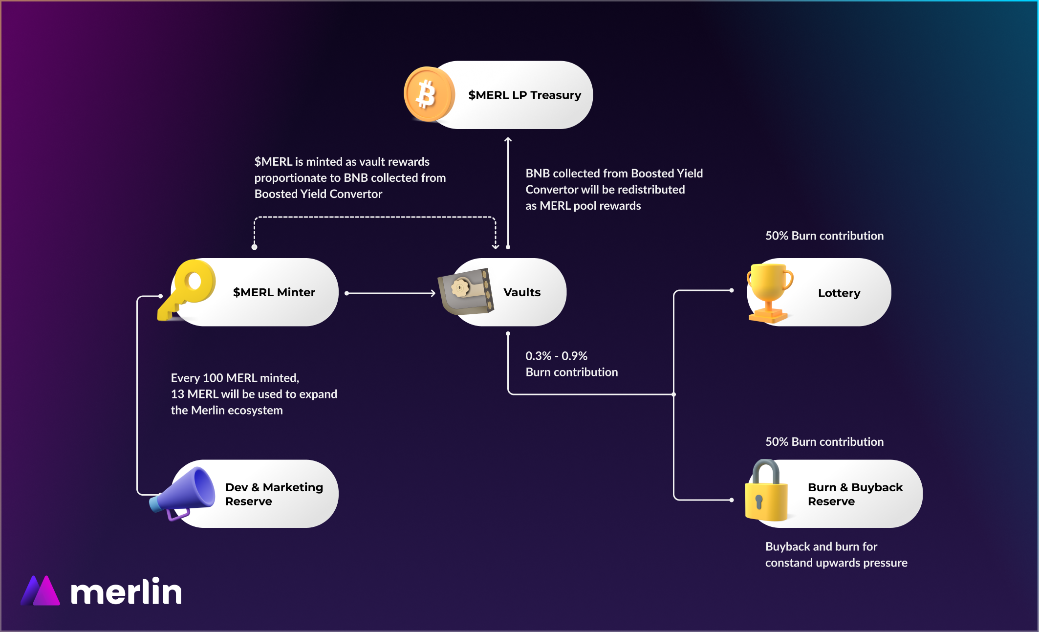 MERL token được tạo ra tương ứng với lượng BNB kiếm được trên nền tảng.