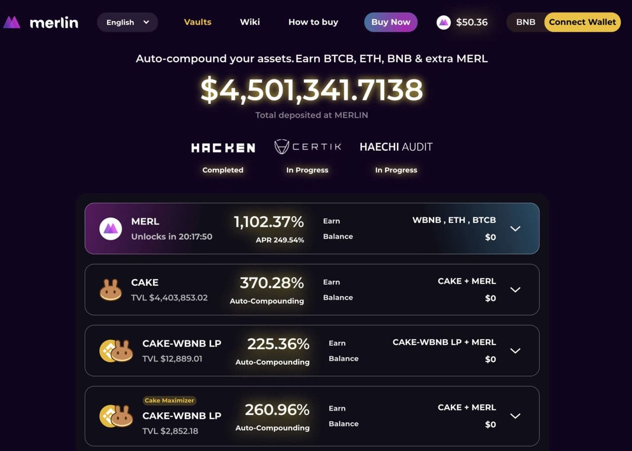 Merlin đã hoàn tất pre-sale ở các mốc giá 10$ và 15$. Hiện Merlin đang cho farming trên pancake swap, và là dự án có APY cao nhất hiện tại.