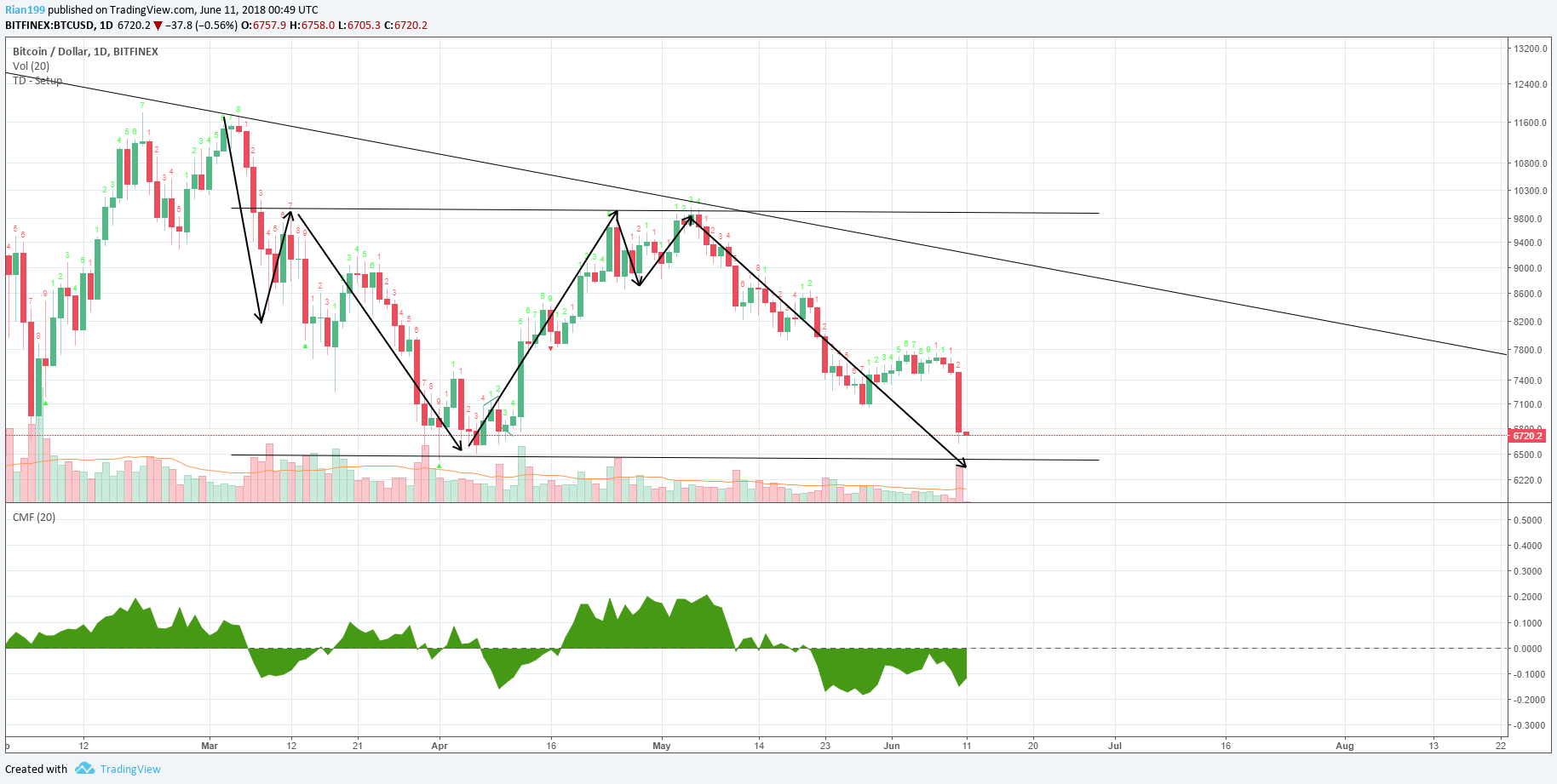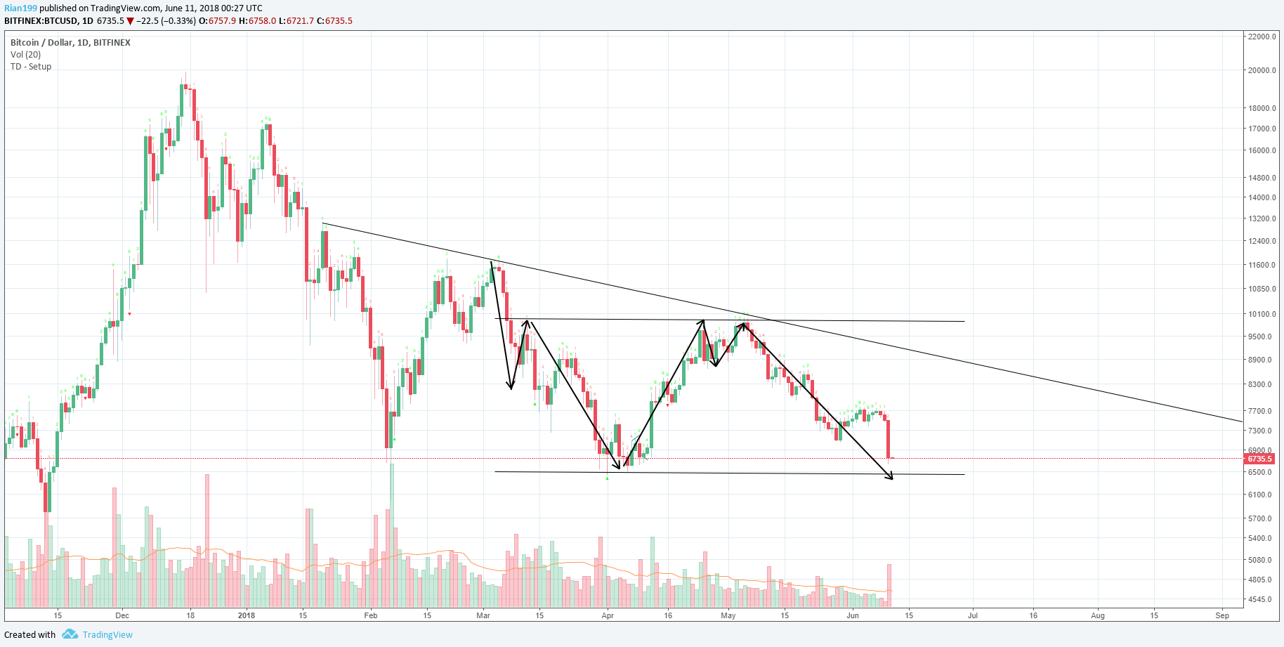 If you look at the double bottom section on stockcharts.com ( http://stockcharts.com/school/doku.php?id=chart_school:chart_analysis:chart_patterns:double_bottom_reversal ), the second example they give you shows a double bottom example of Pfizer in early 2000. I made the comparison between BTC/USD and Pfizer/USD on the daily during that time period and I see some similarities. Check the link to the website, and below I used the TV chart and roughly traced the movements using arrows.