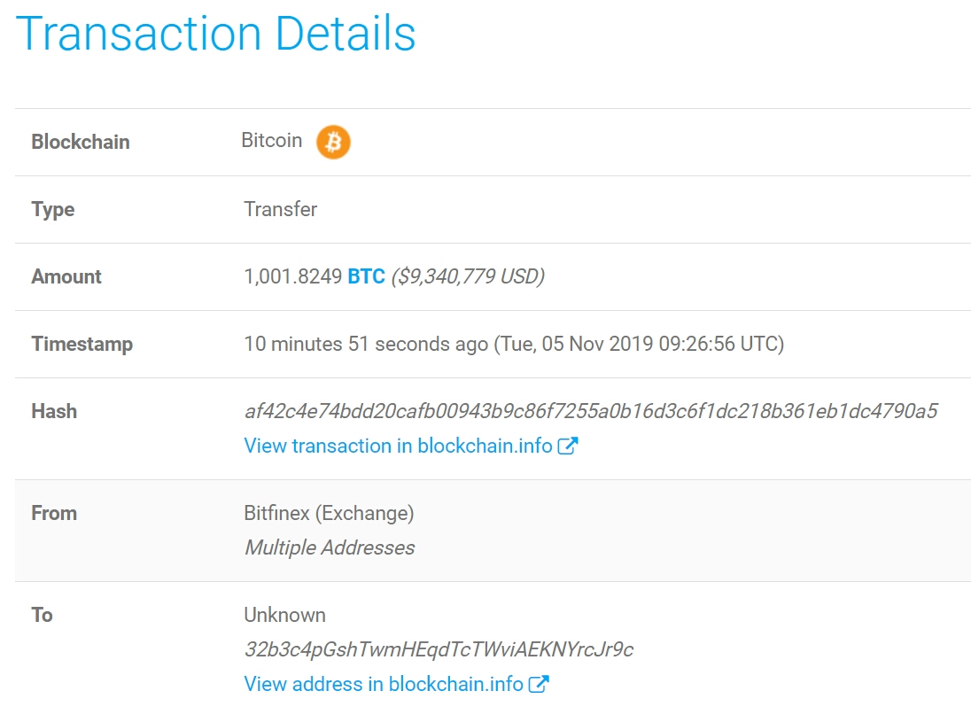 Citing Whale Alert, at 09:26:56 UTC on Nov 5, 1,002 BTC (approx. $9,340,779) were transferred from multiple Bitfinex addresses to an unknown address starting with 32b3c4p.