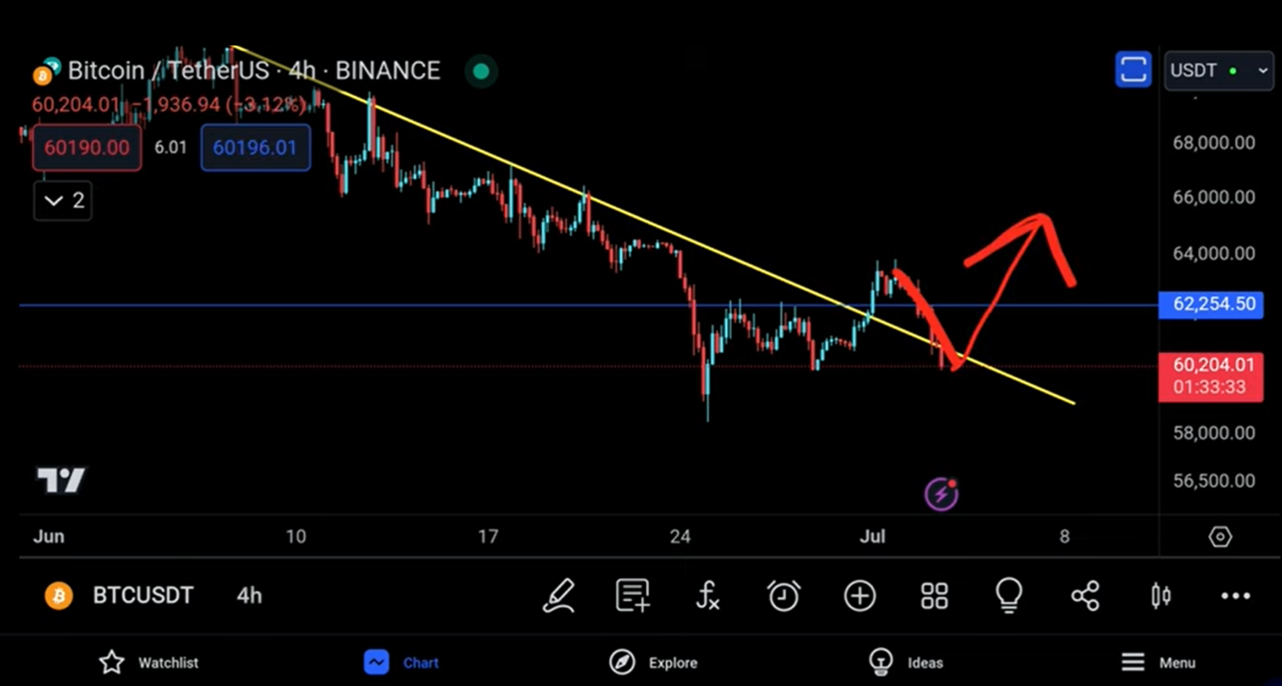 Hi friends Bitcoin 4 Hour time frame here back since March 2024 we've seen a move to the downside a break above we've moved another move to the downside another break above right again similarly another move to the downside a break above but unfortunately is this retest the retest is still pending right we still have a little bit of support going on in here so this retest is important very very important I've spoken about it before saying that it could be that Bitcoin comes to 60,000 one more time and retest and try to push to the upside it's very clear break
