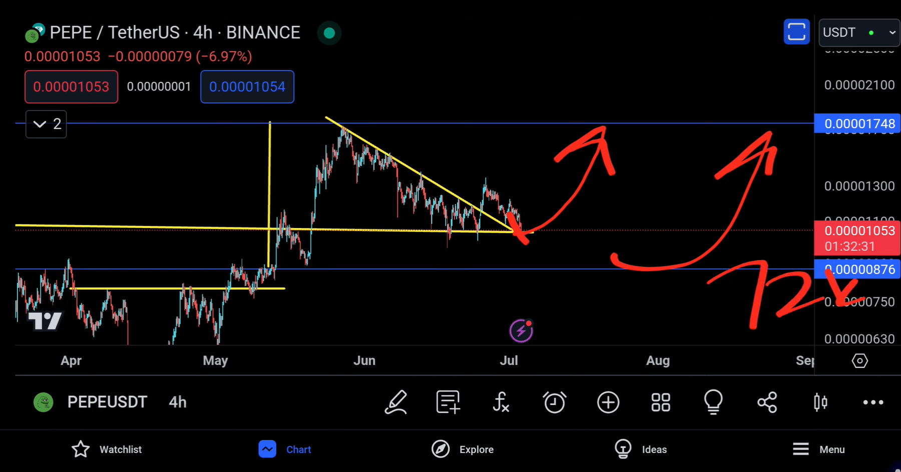 Pepe is also down to the retest situation you can see that's pretty much down going up coming down and I think it's time that we see pape probably just touching this trend line a little bit and then going back up one more time so I think we still have chances there's nothing wrong and this is the only thing I've been talking about for the past 4 to 5 days and of course retests done we go back up again right bit bitcoin also goes back up to 72,000$