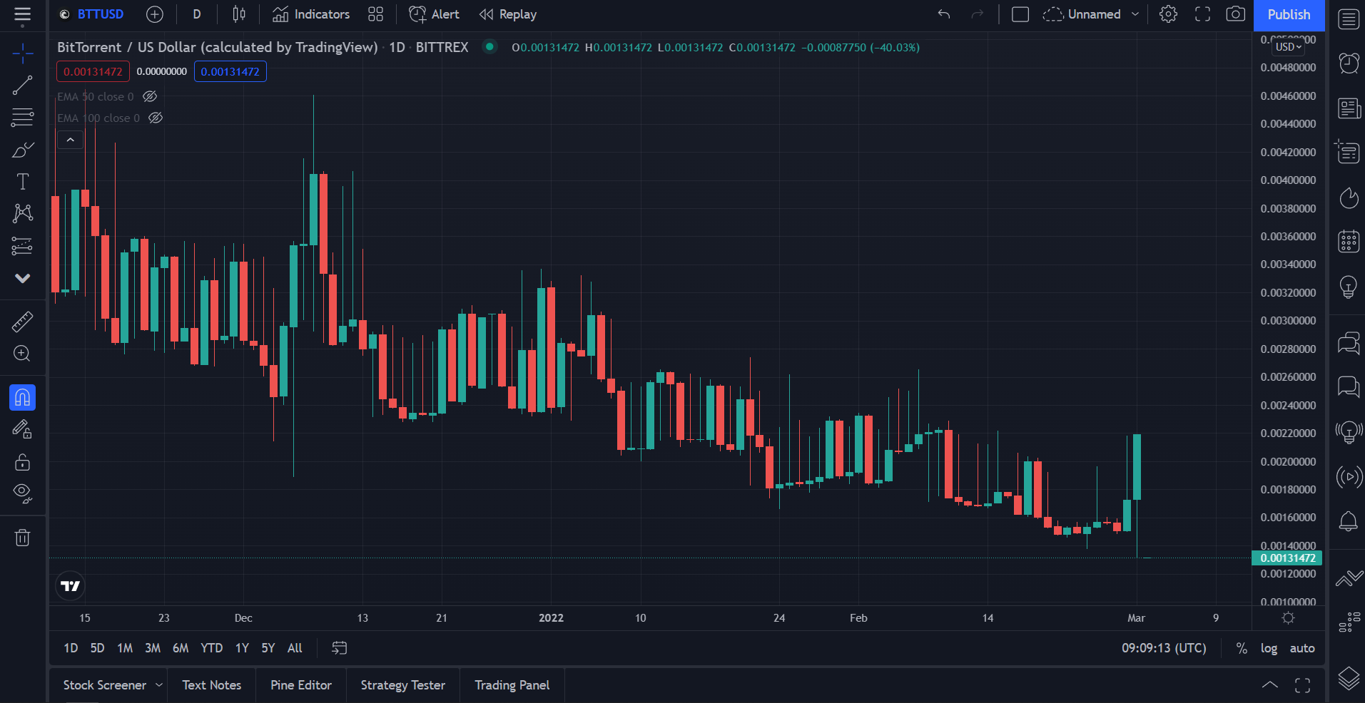BTT current price on March 2, 2022erev (60)in #btt • 4 years ago The price of BTT on March 2, 2022, is $0.001314. #cryptocurrency #currentprice #tradingview