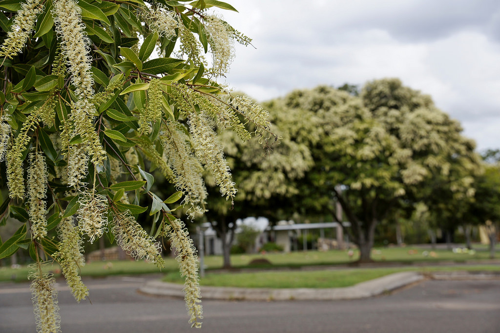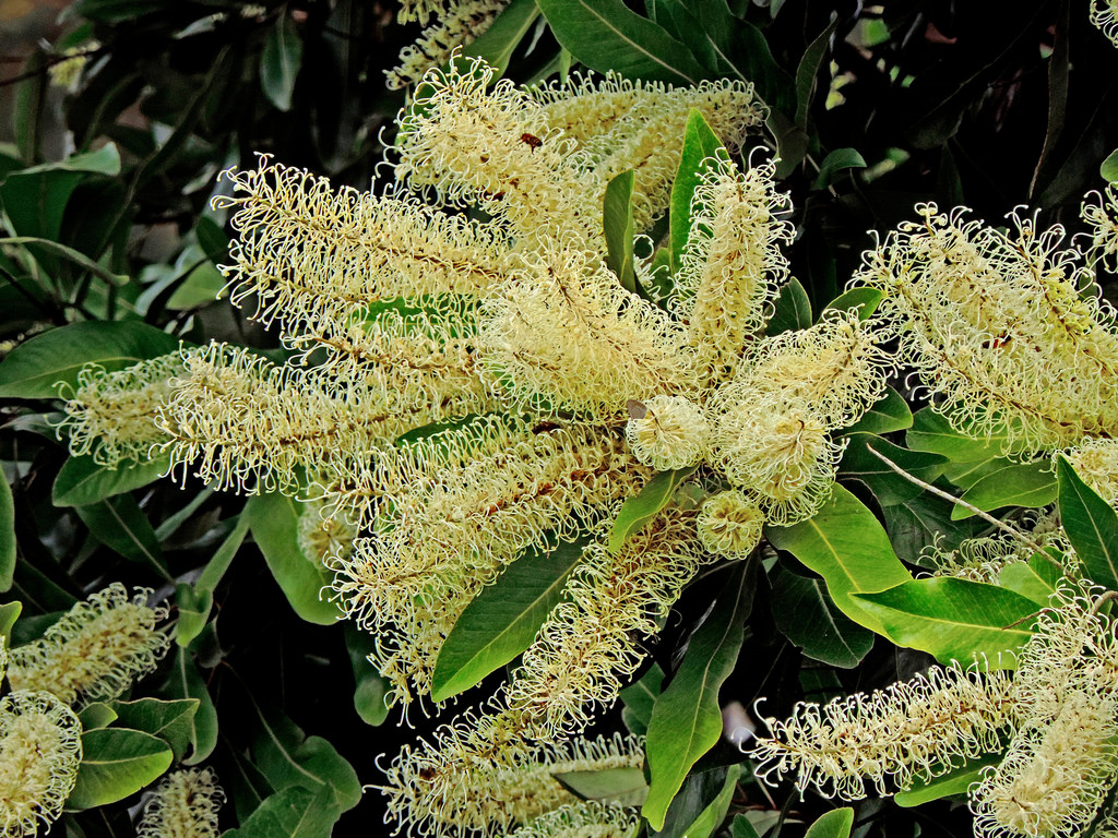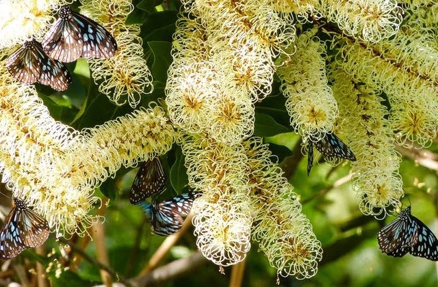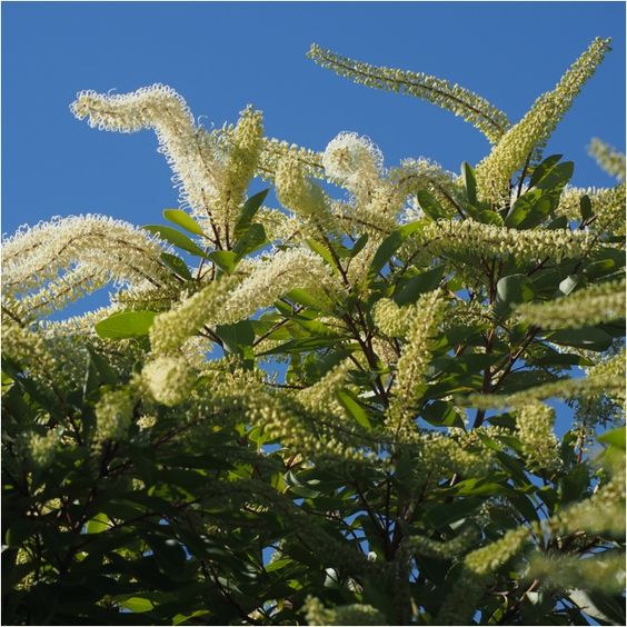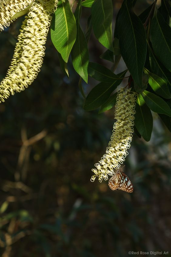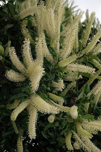 Ivory curls can grow up to 7 meters in height, although different climates may reduce its growth, causing it to reach shorter heights. It takes about 3 to 5 years to reach maturity for flowering. The tree has a skinny grey trunk, with the branches forming a rounded shape at the top. The leaves are longish and dark green, with tips that can vary in colour throughout the year from silver to red. But the crowning glory of this tree is its magnificent, profuse ivory/pale yellow cylindrical flowers. These are so plentiful in number and clustering that they can appear to beautifully overwhelm the tree. Bees 🐝, honey eaters and insectivorous birds are attracted to this tree.