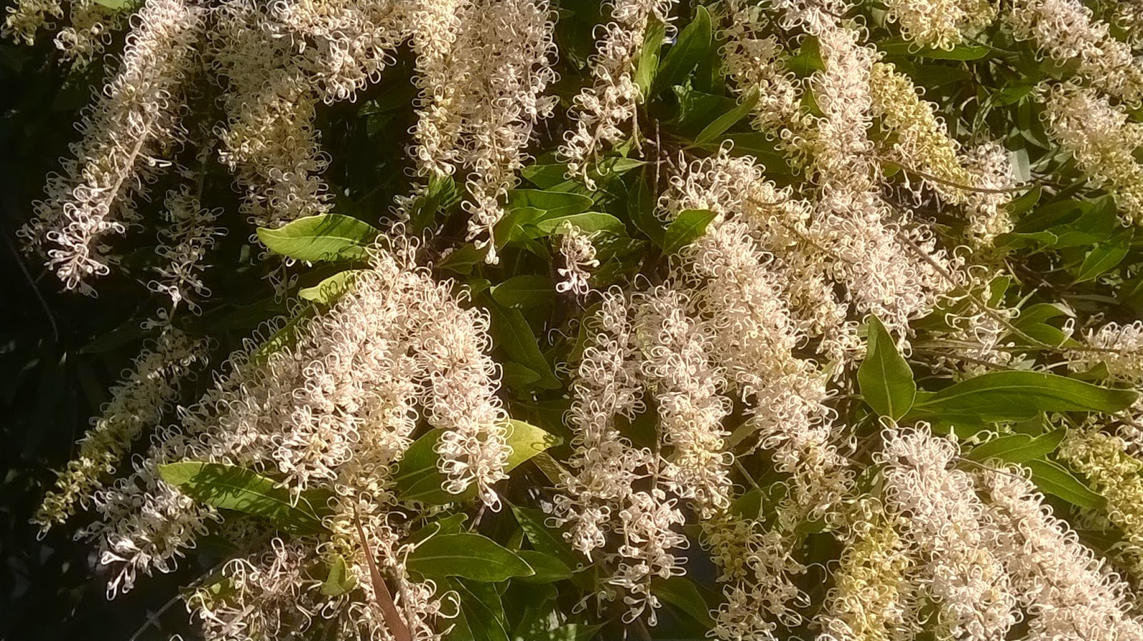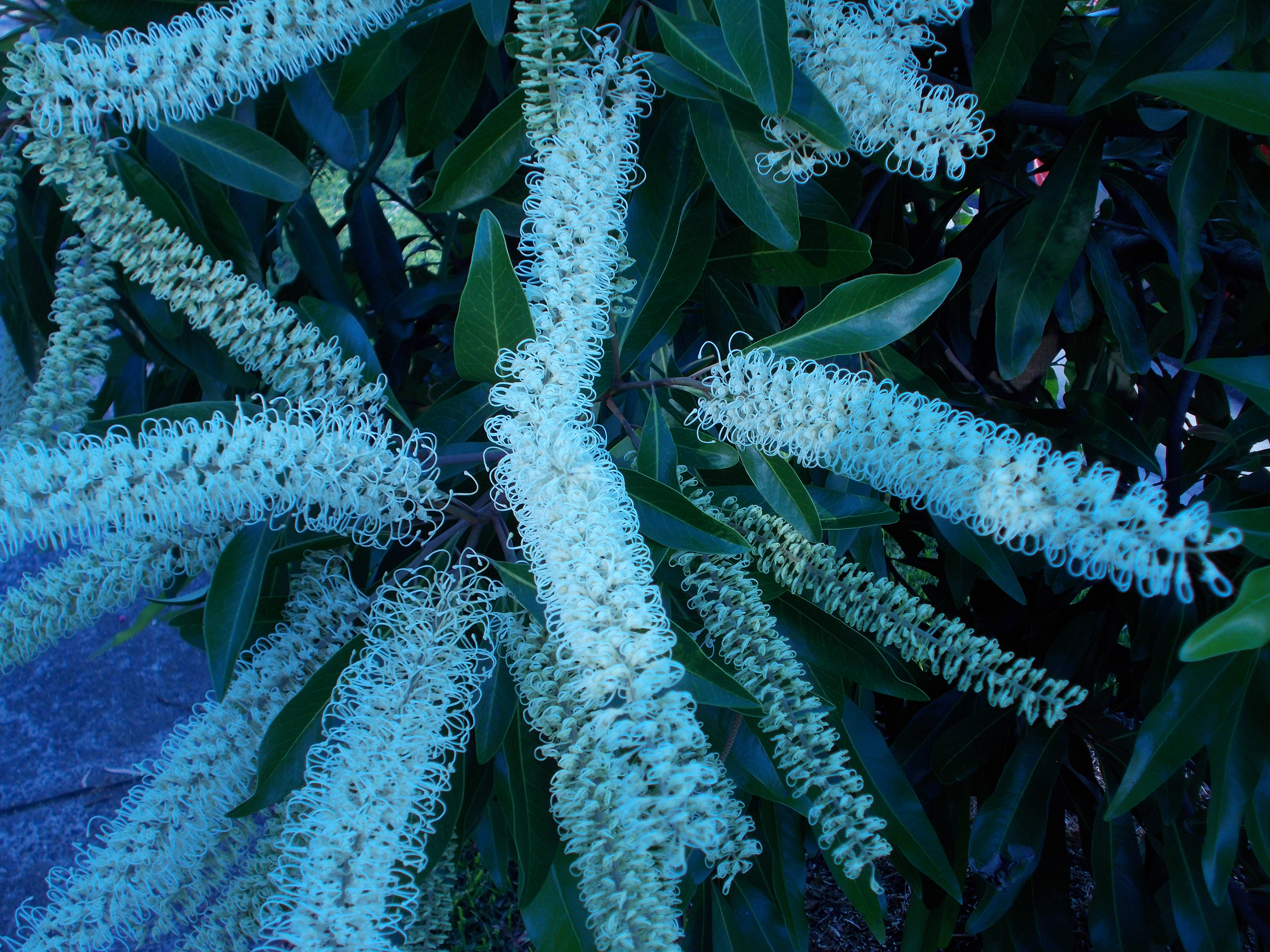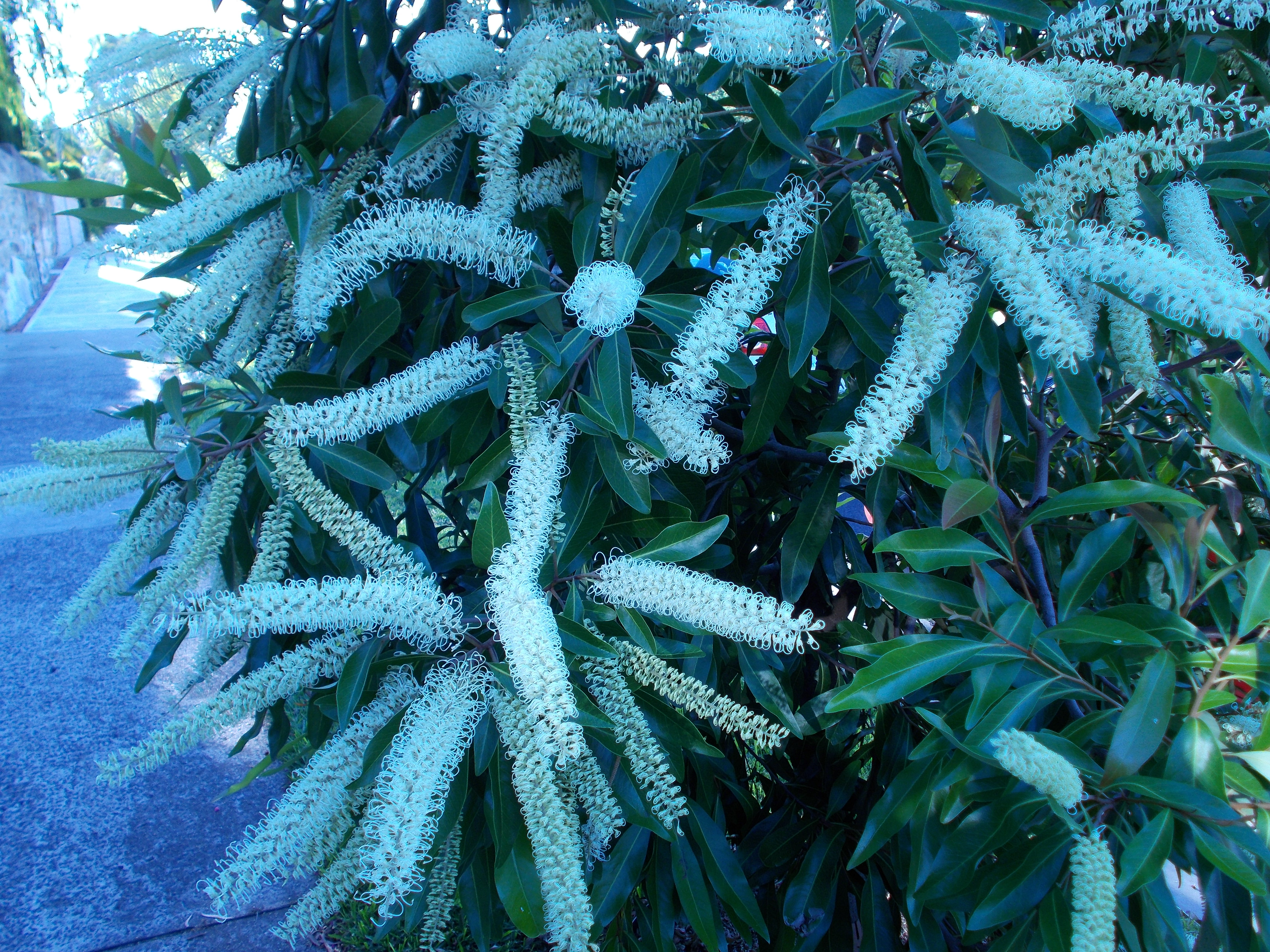 Ivory curls can grow up to 7 meters in height, although different climates may reduce its growth, causing it to reach shorter heights. It takes about 3 to 5 years to reach maturity for flowering. The tree has a skinny grey trunk, with the branches forming a rounded shape at the top. The leaves are longish and dark green, with tips that can vary in colour throughout the year from silver to red. But the crowning glory of this tree is its magnificent, profuse ivory/pale yellow cylindrical flowers. These are so plentiful in number and clustering that they can appear to beautifully overwhelm the tree. Bees 🐝, honey eaters and insectivorous birds are attracted to this tree.