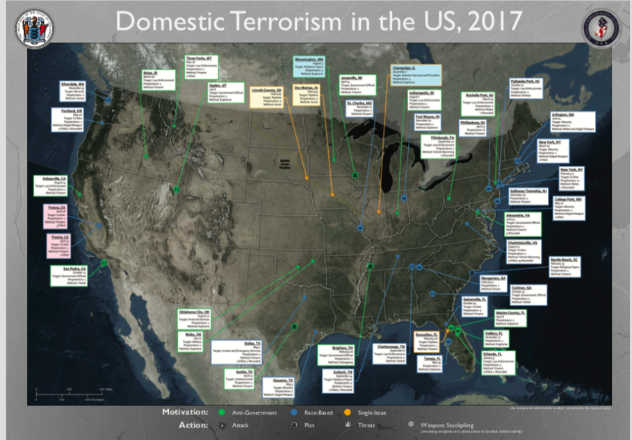 The New Jersey Office of Homeland and Security Preparedness (NJOHSP) created an infographic that shows the domestic terrorist acts in the United States in 2017. Published on June 25, 2018, the infographic, which uses publicly available data, states, “45 domestic terrorist attacks, disrupted plots, threats of violence, and instances of weapons stockpiling (were) committed in 2017.”