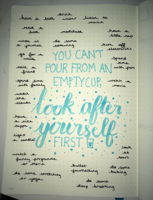 Mind: These would be activities that are encouraging and excellent for your mind. Some activities that would go along with this aspect are, talking to someone, or creating affirmations.