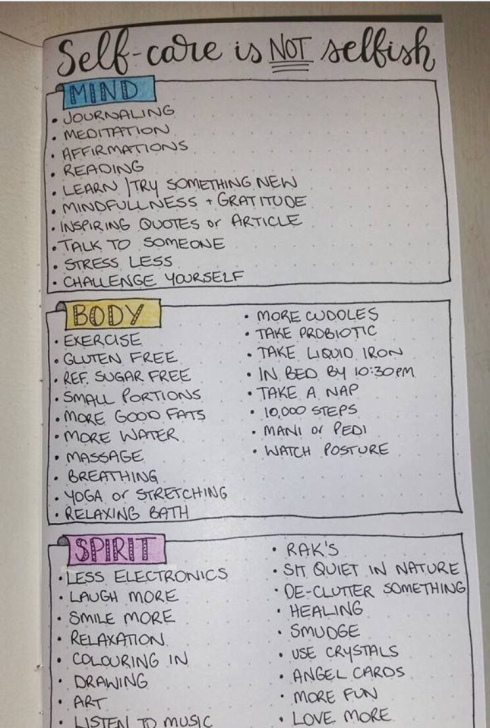 Spirit: These would be activities that are good for your soul. Some examples would be praying, colouring, or loving life more.