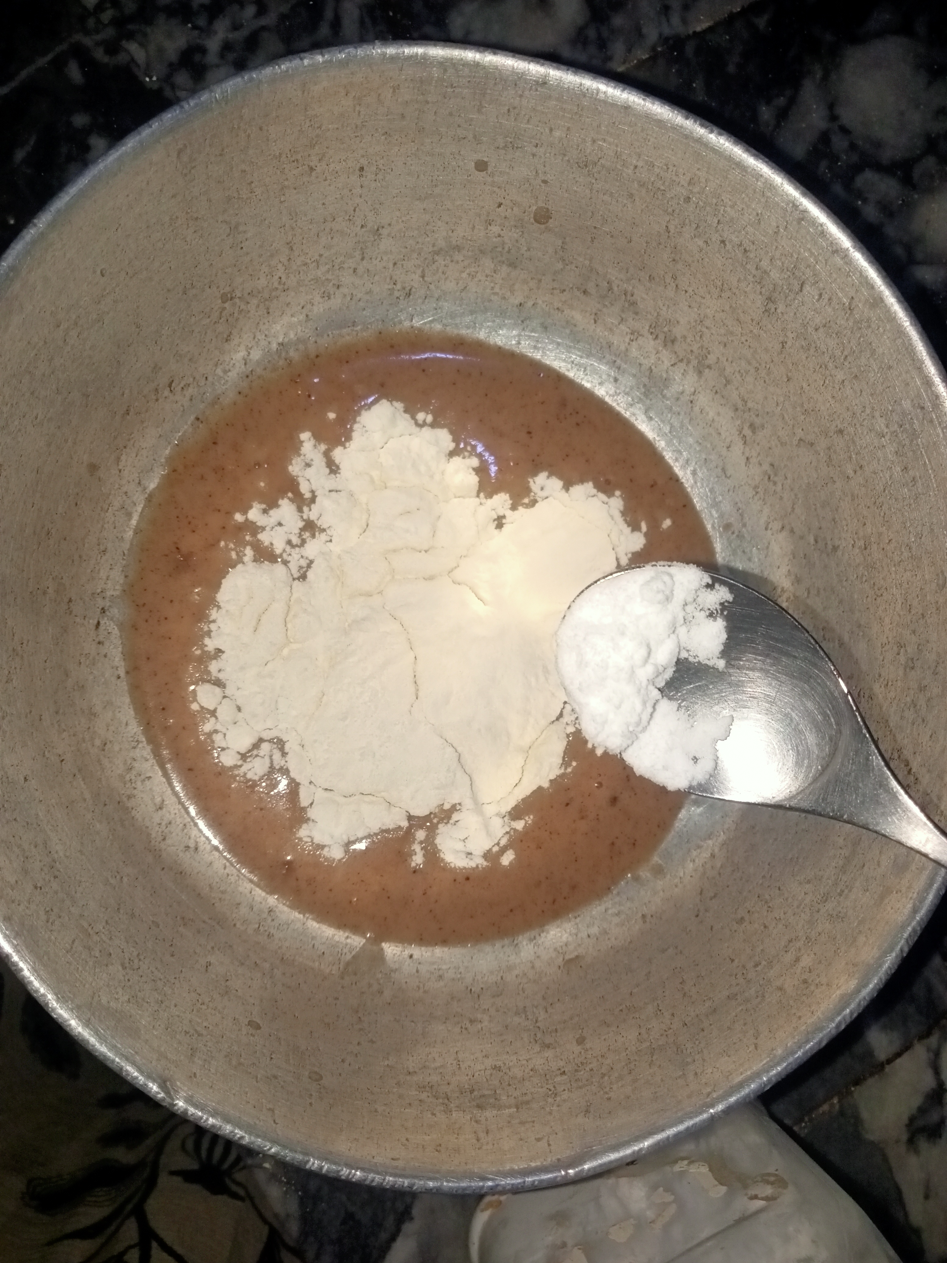 Then I add this mixture in a bowl where I need to prepare a dough for cookies so I add all purpose flour in it and also add baking powder in it.
