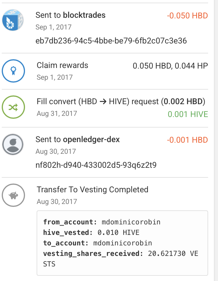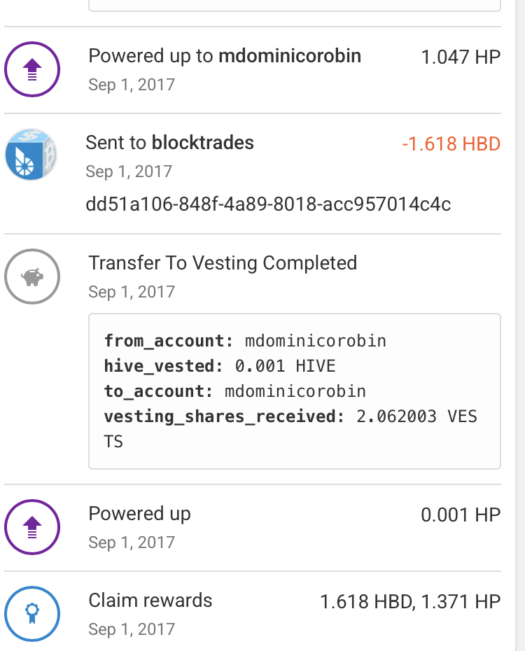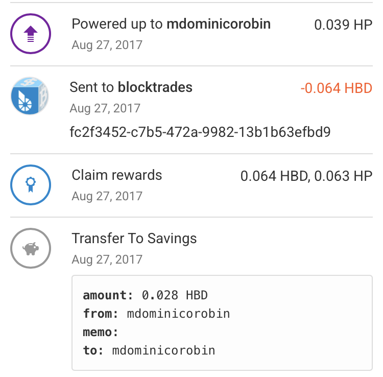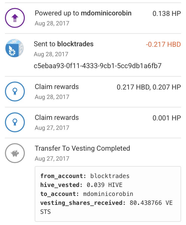 After claiming my rewards from the previous snapshot, I transferred it to savings. During that time (2017) this idea or concept is unparalleled and up until today I could spot different platforms adopting the idea of staking which was power up in the universe of Steemit. They have the concept of curation rewards for upvoters. The upvote you make is as potent as your Steem Power level. I have claimed more rewards the same day (August 27, 2017) which was also unique during that time. All the blogging platforms before the birth of Steemit was for lack of a better term exploitative. Only Steemit has a structure built in that will be soon labeled as Proof Of Brain (POB). Another unique concept which was emulated for most part by the envious entities. You will notice “blocktrades” in the transaction database. This is a companion trading platform that handled Steemit token conversions and multi chain conversions as well. I came to love it since I was not used to spot trade being stuck in limbo once my bid turns out to be too low or too high. As you can see I also performed a staking operation to end this portion of my blockchain snapshot.