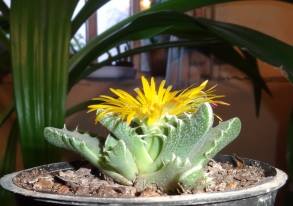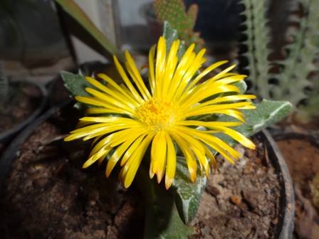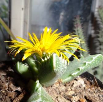 This somewhat ferocious-looking succulent gets its name, tiger-jaws, from the appearance of the toothed, triangular shaped leaves which seem to drip with 'saliva' and are held ajar in a menacing poise. The eye-catching leaves, together with the large yellow flowers, certainly make this plant a striking addition to the home as a potted plant or as a feature in a rockery garden.
