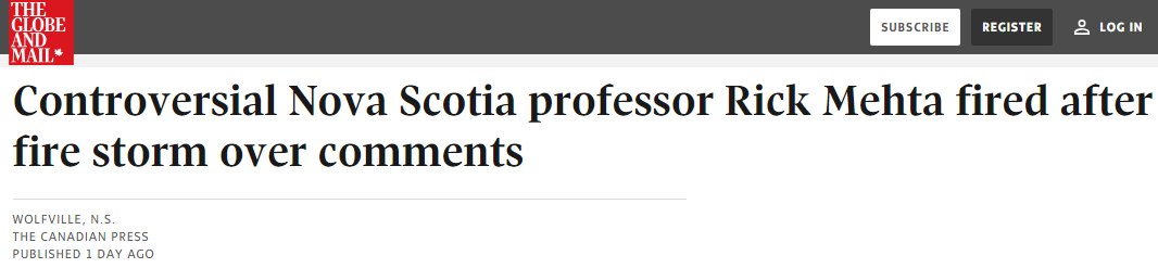 "We can confirm that Dr. Rick Mehta, a professor in Acadia University’s Department of Psychology, has been dismissed by the University. As this is a personnel matter, the University will provide no additional comments or respond to requests for further details.”