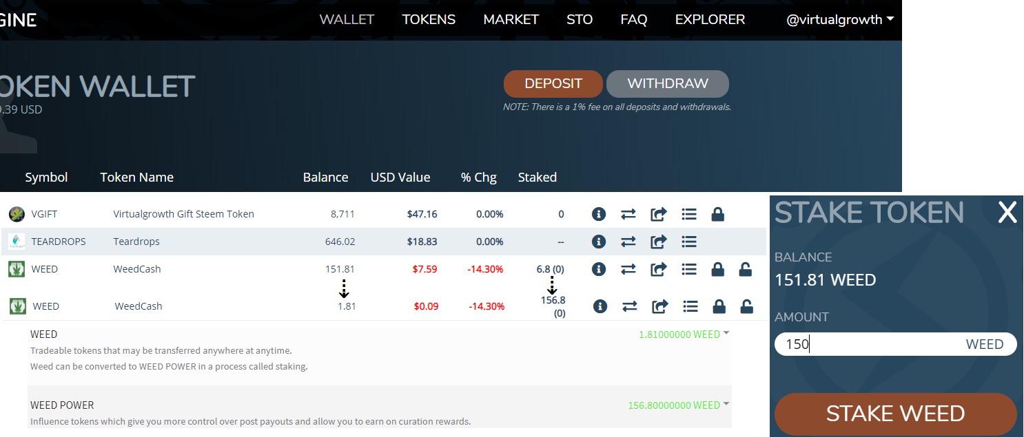 Here’s the deal: If you buy on the market 50 to 150 WEEDCASH and Stake them up in your Steem-Engine Wallet, I will double that amount for you.