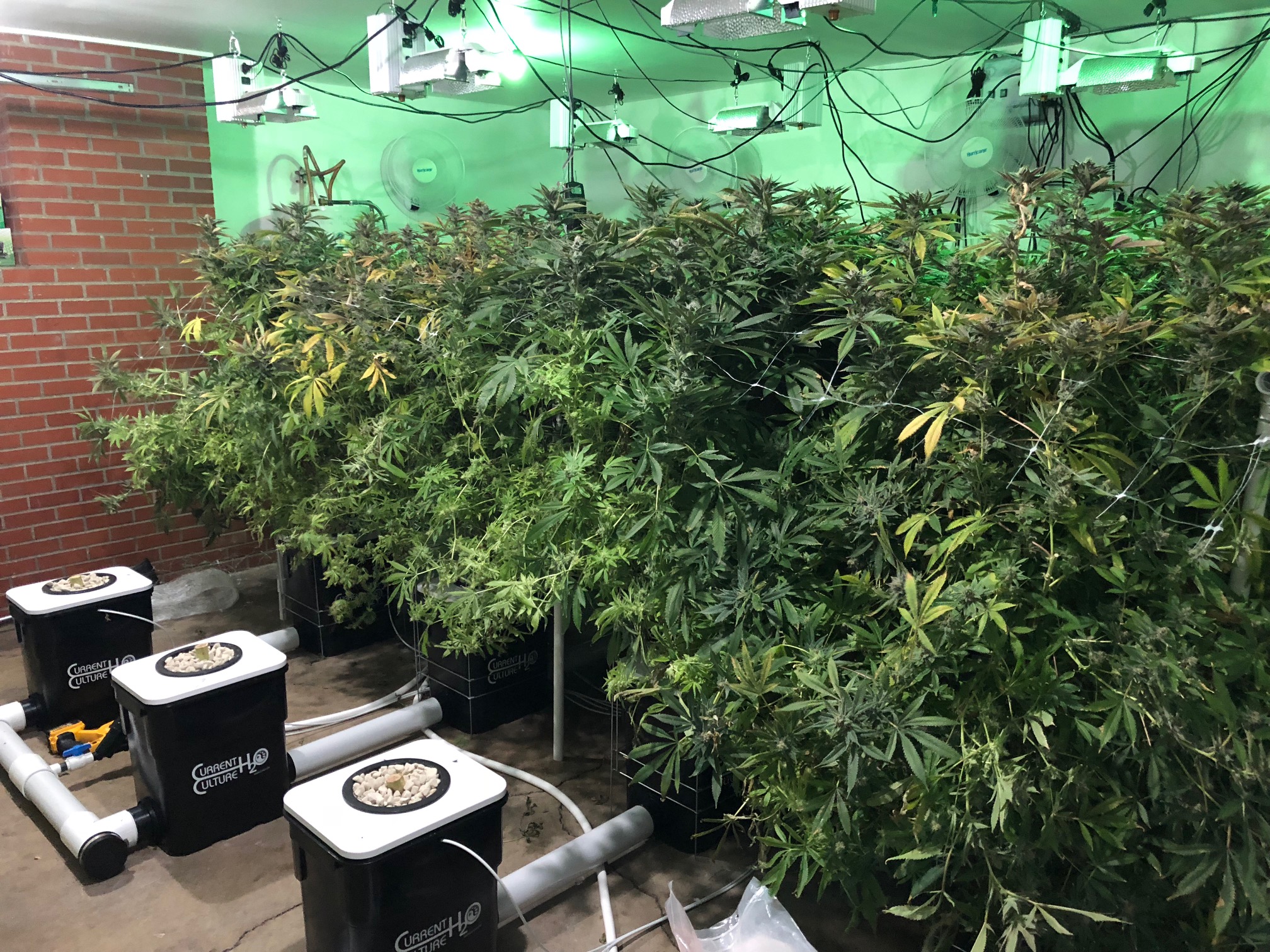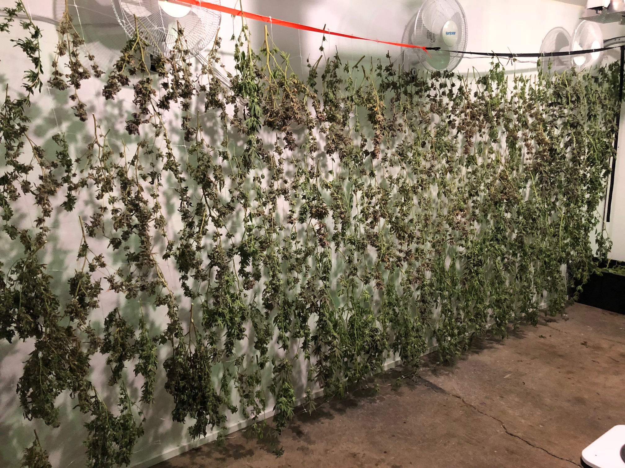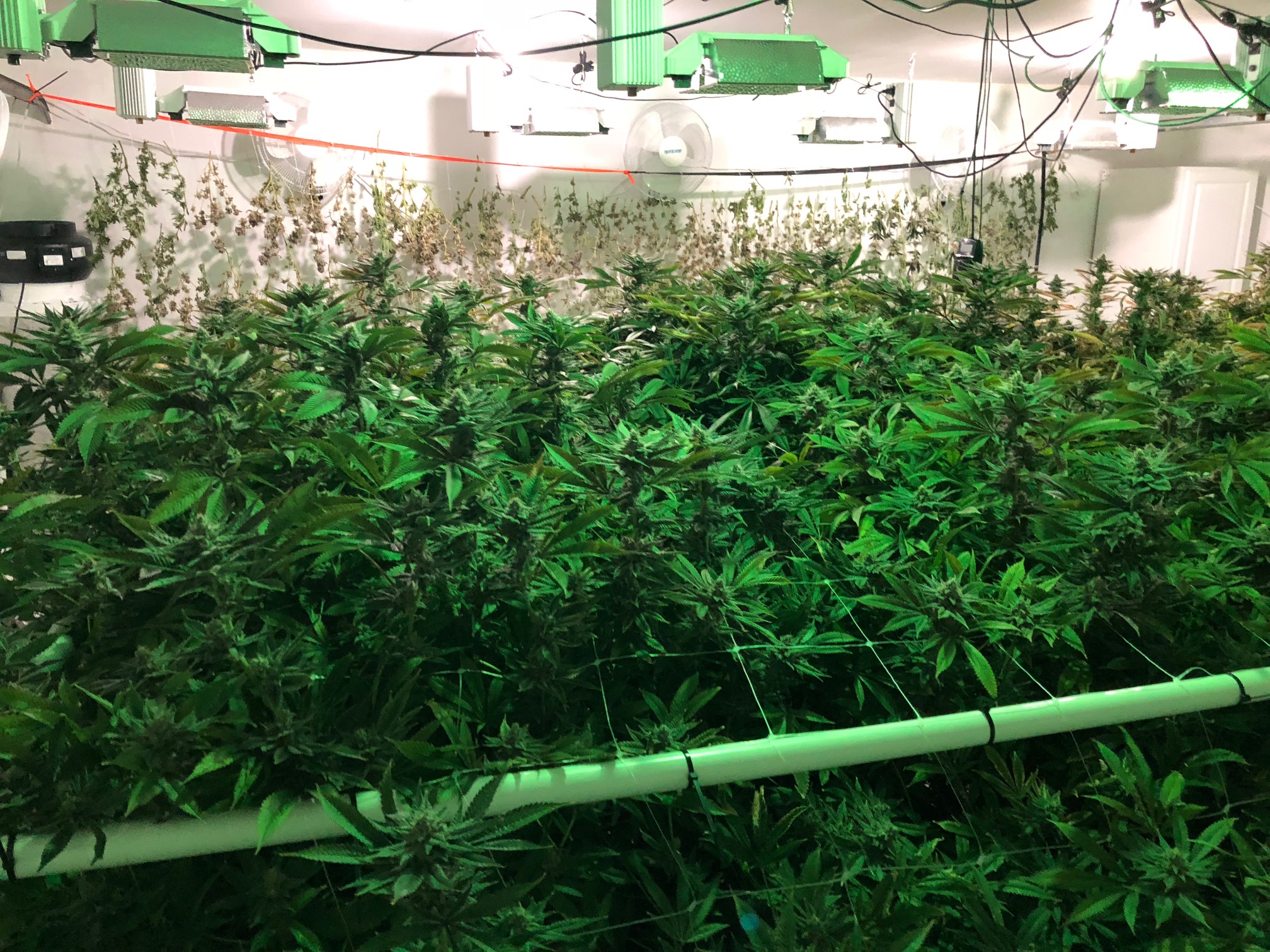 Here is a larger picture. In the back of the room, there is a temporary net to hang the cannabis to dry. Normally, the grower doesn't dry the cannabis in the grow room. Instead, they would be starting the next crop and drying in another room. This property doesn't have the additional climate controlled space for the drying. It is a considerable amount of work to harvest, and the first day of harvest processed 4 of the 12 plants.