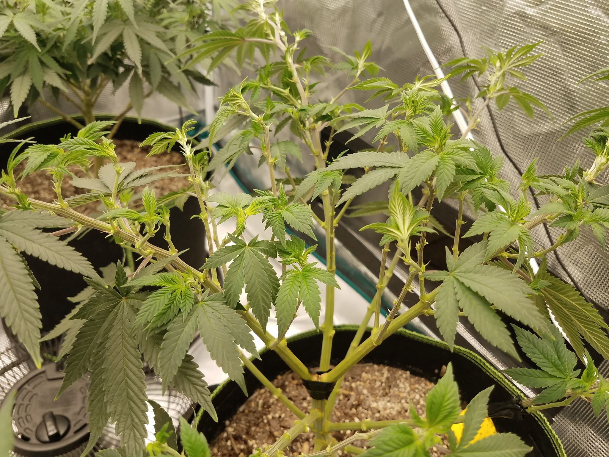 You can see how intense the node spacing is on these plants. I'm going to have a lot of colas when I finally flower it. The plan is to now scrog next weekend finally, and take them into flower a week later.