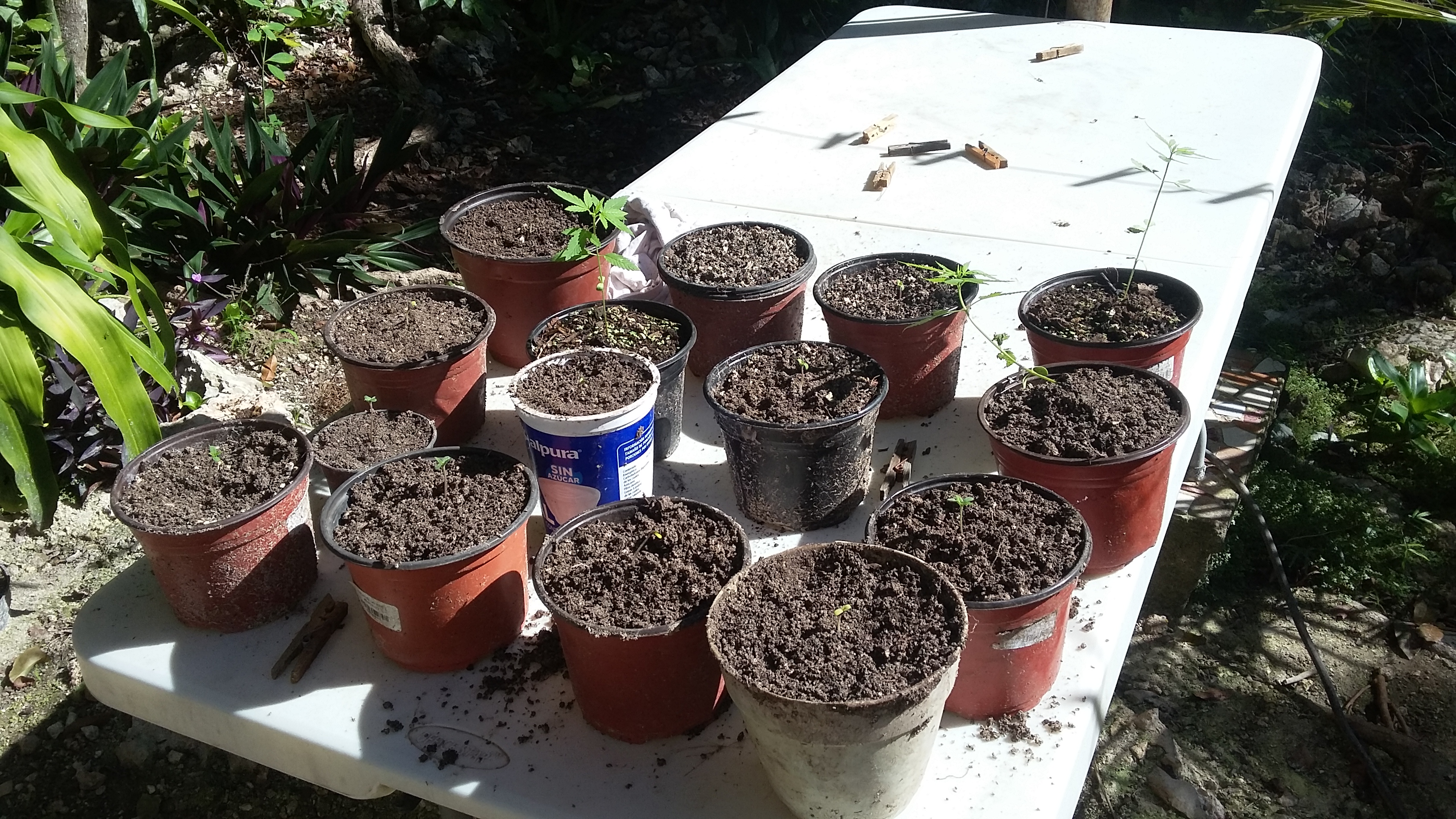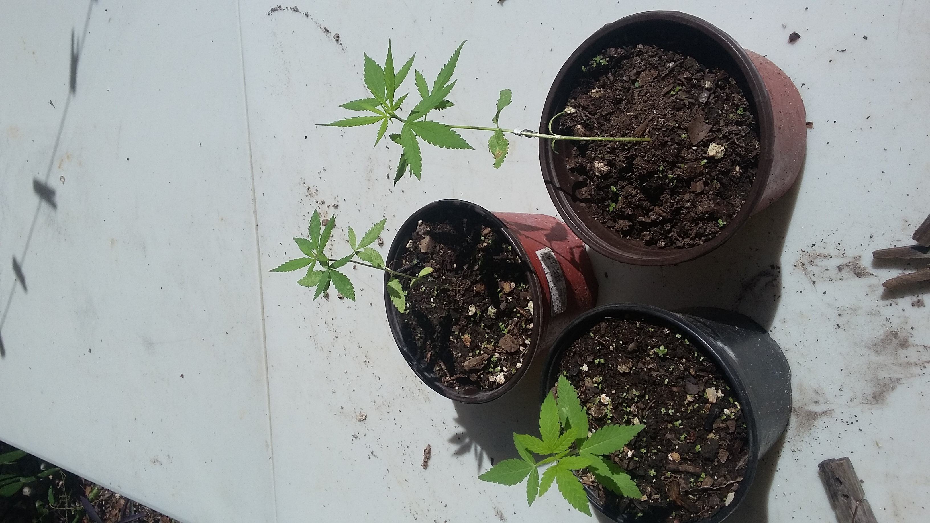 After getting some Lemon Diesel bud, I slowly collected the few seeds it had. I used dirt that was from a cooled off compost pile, but I'm not sure what the pH is. I added some ash because previous testing of soil it ran pretty high. The larger plants are almost 3 weeks old. I plan to take them and put them on 24 hour light starting tonight. I'm trying some light stress training on one plant and it responded already by trying to lay more roots on the stem. Everything is getting plenty of sweet rain water collected from the recent rains.