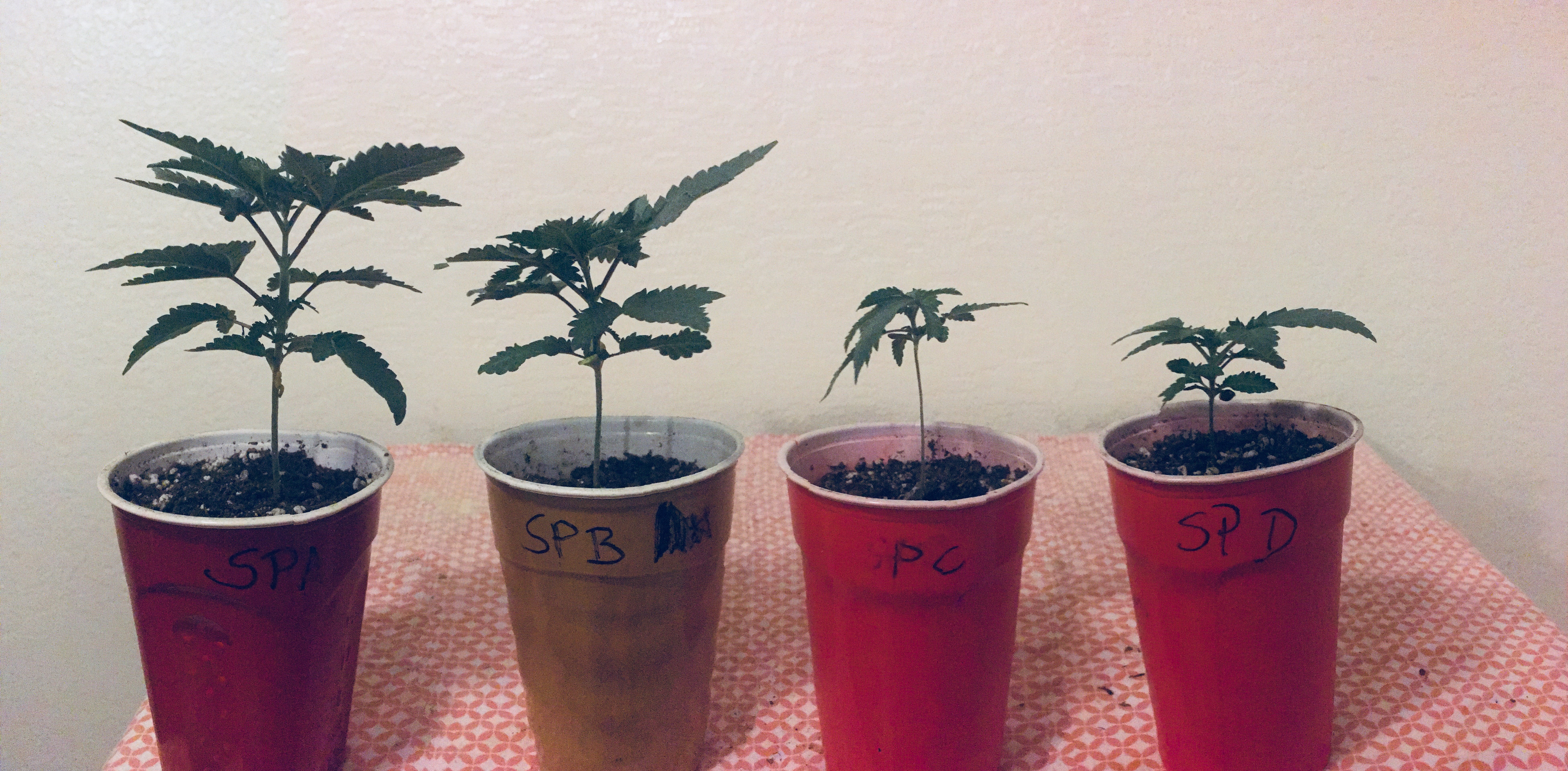 What did you think I was bragging about my wallet? Lol, nah nothing to brag about there. But still doesn’t mean I don’t love this platform less then sombody with thousands of SP! What I lack financially, I make up in enthusiasm. As you can see with my tribute to this great platform, Steem Og, cryptos first Cannabis strain. Steem Og was made by crossing two Santa Ritas(Tahoo Og x Inca Gold). Let’s take a look at the 4 I got going. Each is labeled with a letter until a female presents itself then I’ll assign a number.