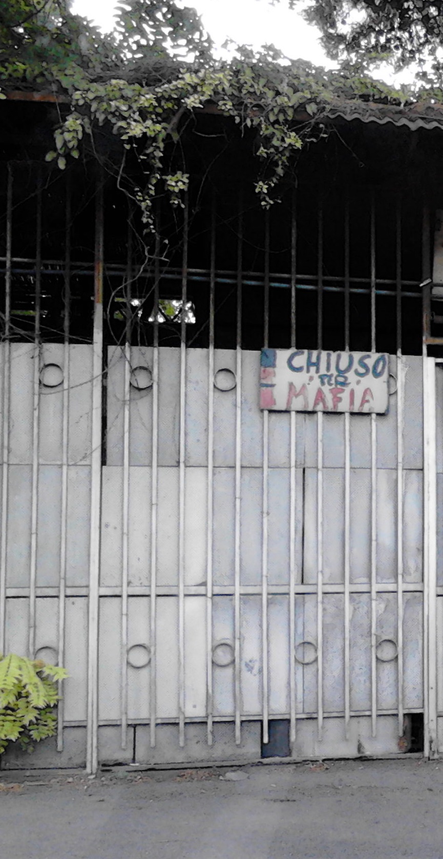 Questa foto è stata fatta mentre ero fermo al semaforo in una zona di periferia; la baracca non dava molto nell'occhio ed è stato un caso che mi sia accorto del cartello. Ce n'era un altro meno leggibile che recitava: "ristorante distrutto da una cricca di banditi"