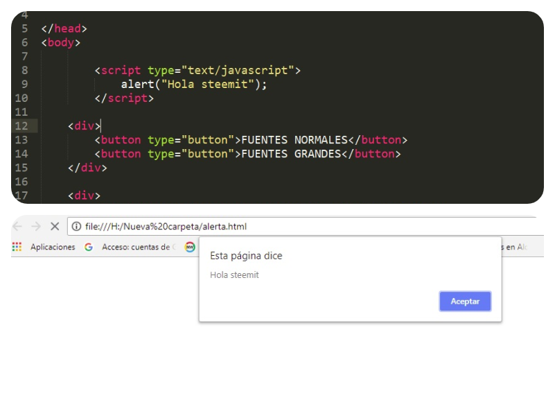 script type="text/javascript" , seguido del "Alert" alert("Hola Steemit"); y entre los paréntesis colocamos el mensaje que queremos mostrar en mi caso coloque `"Hola Steemit"`y para finalizar terminamos cerrando la etiqueta /script