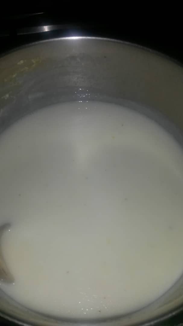 Ralle una cebolla, y coloque con la margarina en una olla. Deje sofreír por 5 minutos o hasta que cristalice la cebolla, agregue 1 litro y medio de leche, sal y pimienta al gusto, con el resto de la leche en la leche de maíz y esta preparación cuando se hierva la leche. Deje espesar y retire del fuego.