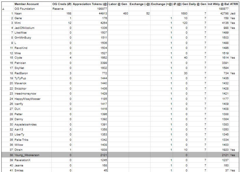 In Block #211, ending 10/25/2021, a total of 2741@ (Appreciation Tokens) were generated; 371@ were generated by the daily appreciation of 53 members, 480@ were generated by 48 hours of labor exhausted for the Cooperative, and 1890@ were generated by 189 OG Creds (Ø); bringing the total to 342,407@.