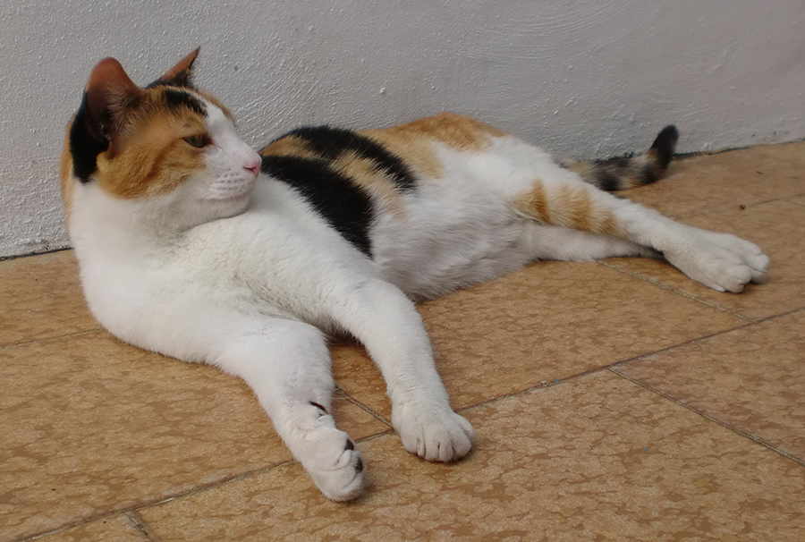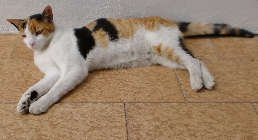 En este Caturday, Kitty se muestra pensativa. Anoche hubo un extraño intruso en la zona, una horrible zarigüeya. En un principio pensamos que se trataba de otro gato, o de una rata gigante. Sin embargo, al analizar el registro de las cámaras de seguridad pudimos constatar que se trataba de ese animal. Kitty no le mostró miedo, sino más bien curiosidad, y finalmente logró echarlo de aquí.