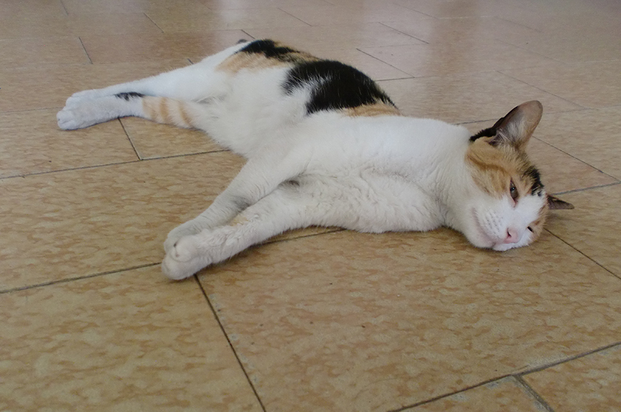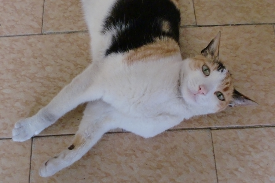 En este Caturday, Kitty se muestra muy alerta. Anoche entró en su territorio un gato callejero que pretendía robar su comida. Kitty le dio su merecido y expulsó al invasor. Ella es prudente pero decidida a no dejarse quitar lo que es suyo. Kitty suele tener cambios bruscos en su comportamiento según los estímulos que reciba. Puede ser cariñosa o violenta, según las intenciones de quienes le rodean.