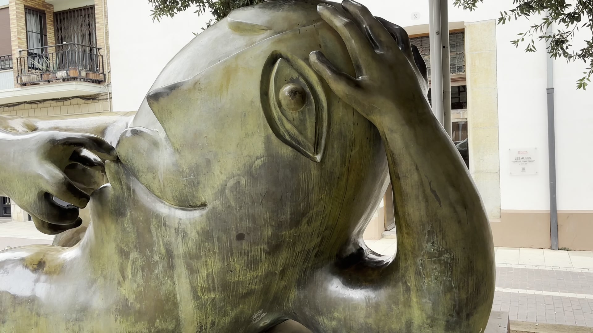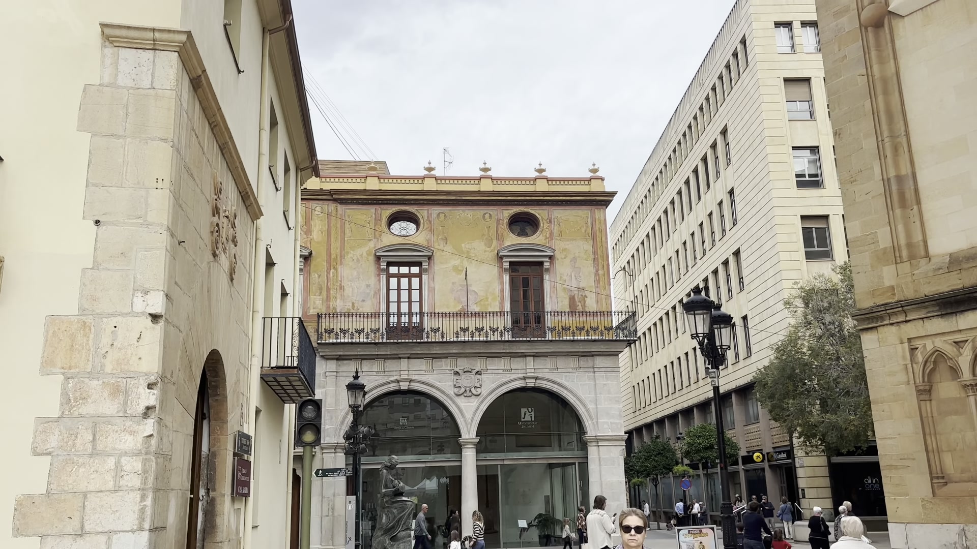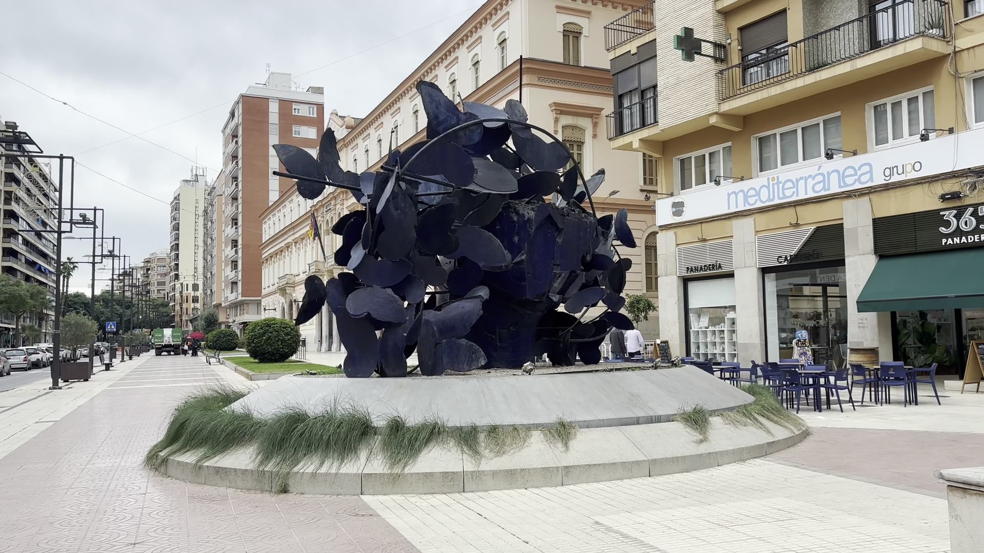 I walked around watching the historic houses with their solid doors. The balconies are beautiful. The streets look similar to each other, with low-rise buildings. We reached the other end of the historic center, where the building stands in which Castellón’s representatives meet and local decisions are made. Nearby, there is another piece of modern art. Castellón has many of these and you can spot them while walking around the city.