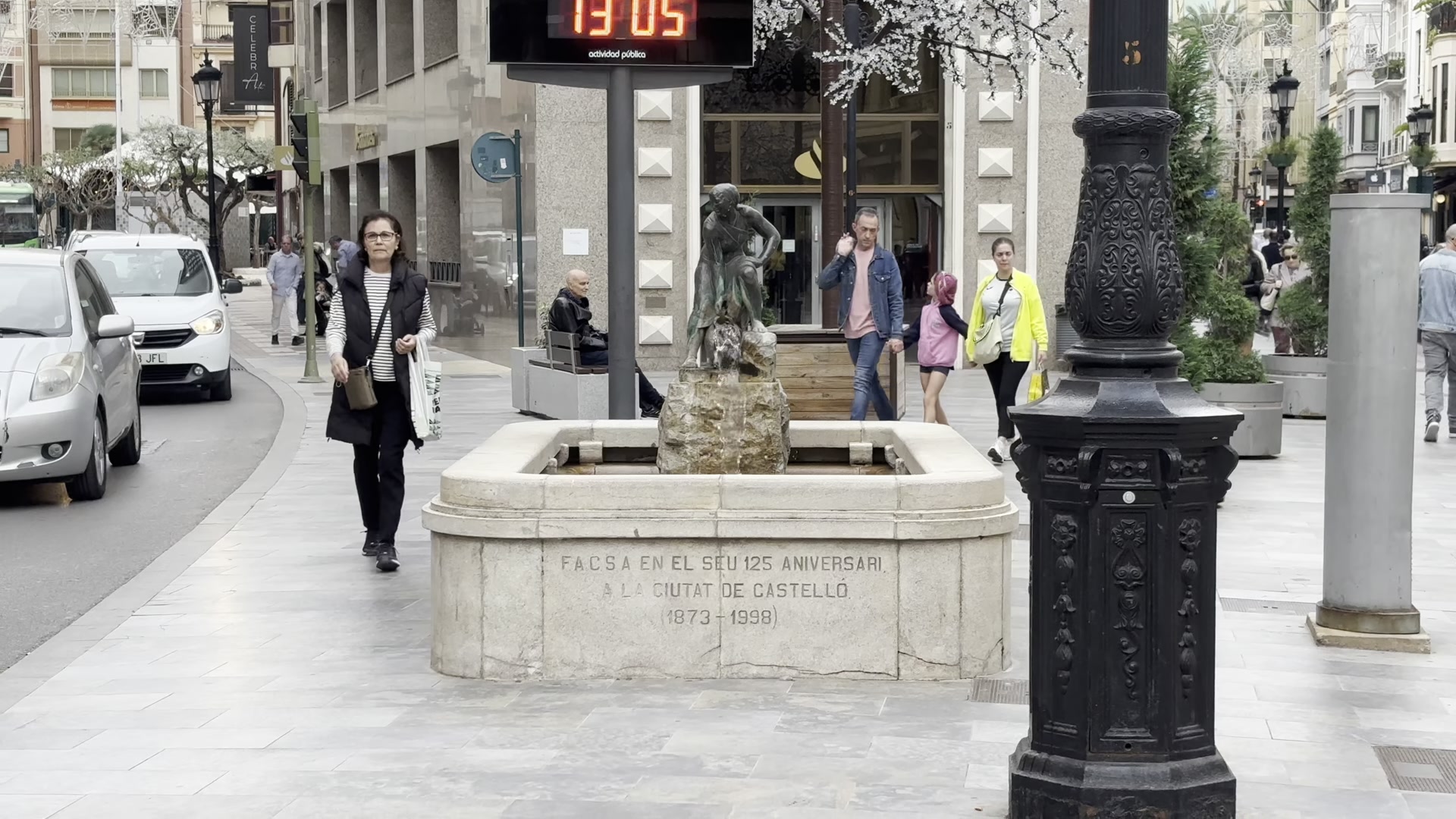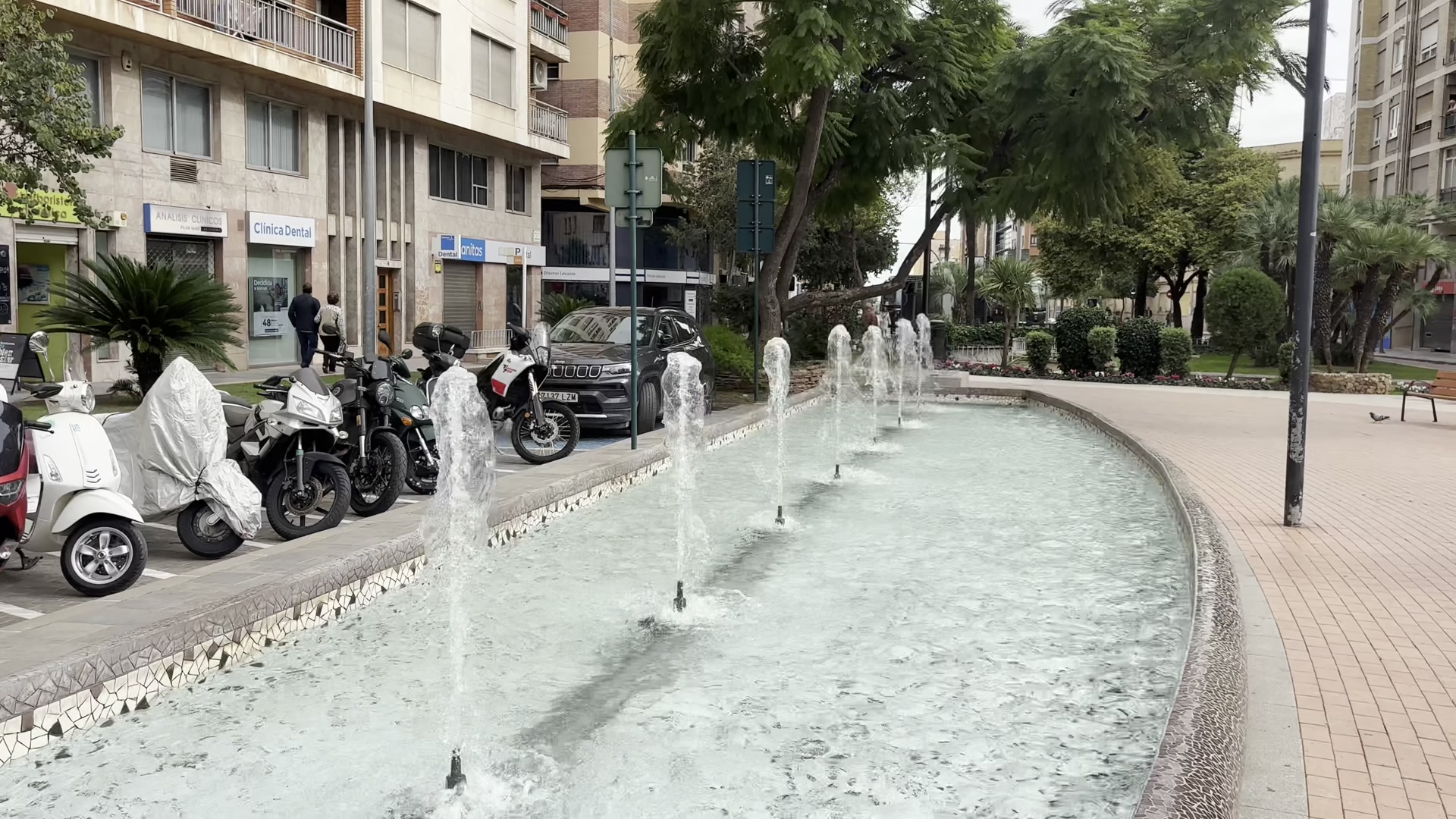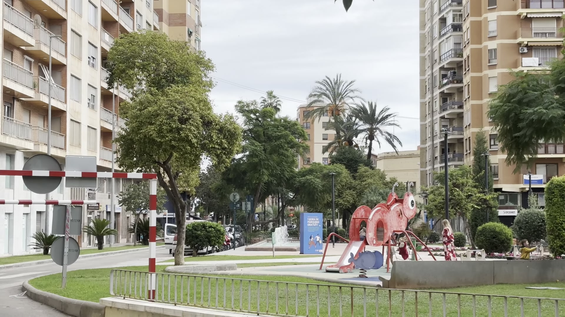 I also saw a modern sculpture. Castellón has many examples of modern art like this and most of them are quite interesting. We then reached the end of the Casco Histórico. After this point, you mostly see apartment buildings from the 1970s. Some are newer, some older. There is a green area here with a playground, a fountain further ahead and palm trees, a very pleasant spot. If you keep going straight, you can reach the Mediterranean Sea in a few kilometers.